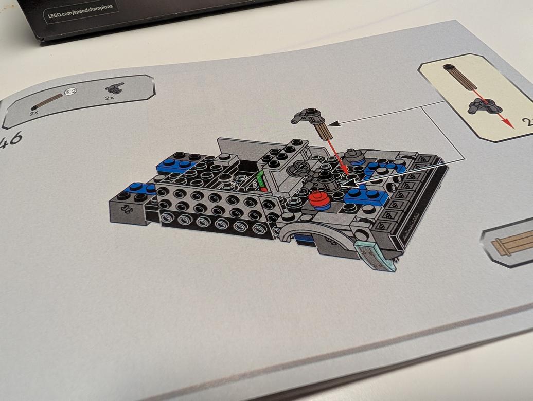 Detta är ju ett relativt billigt set för 9+, vilket gör att vi tyvärr inte får en detaljerad manual med information som det finns i de större entusiasm-seten inkluderat. Det är ett foto i början men en rolig detalj som jag lade märke till; att i steg 88 har de ändrat font och färg på siffrorna till att påminna om texten i logotypen för Back to the future som en liten homage. Något som gjorde mig glad och det stack ut. I övrigt är det inget speciellt utan små steg för steg. Som alltid nu för tiden kommer klossarna i små papperspåsar som vi sedan lägger i pappersåtervinningen.