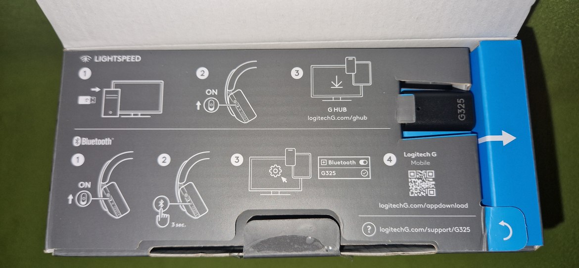 När jag öppnade upp förpackningen, tyckte jag att det lovade gott när det direkt under locket fanns bildinstruktioner om hur du kopplar ditt headset till de olika plattformarna via antingen blåtand eller LIGHTSPEED (dongel). Pappersbladet som medföljer handlar endast om batteribyte och säkerhet. Vanligtvis, och även här finns det en QR-kod vid bildinstruktionerna som ska ge dig tillgång till app-nedladdning, tyvärr möttes jag när jag skannade den med mobilen av en 404 – sidan hittades inte. Som tur är det här inte ett headset som är svårt att förstå sig på.
