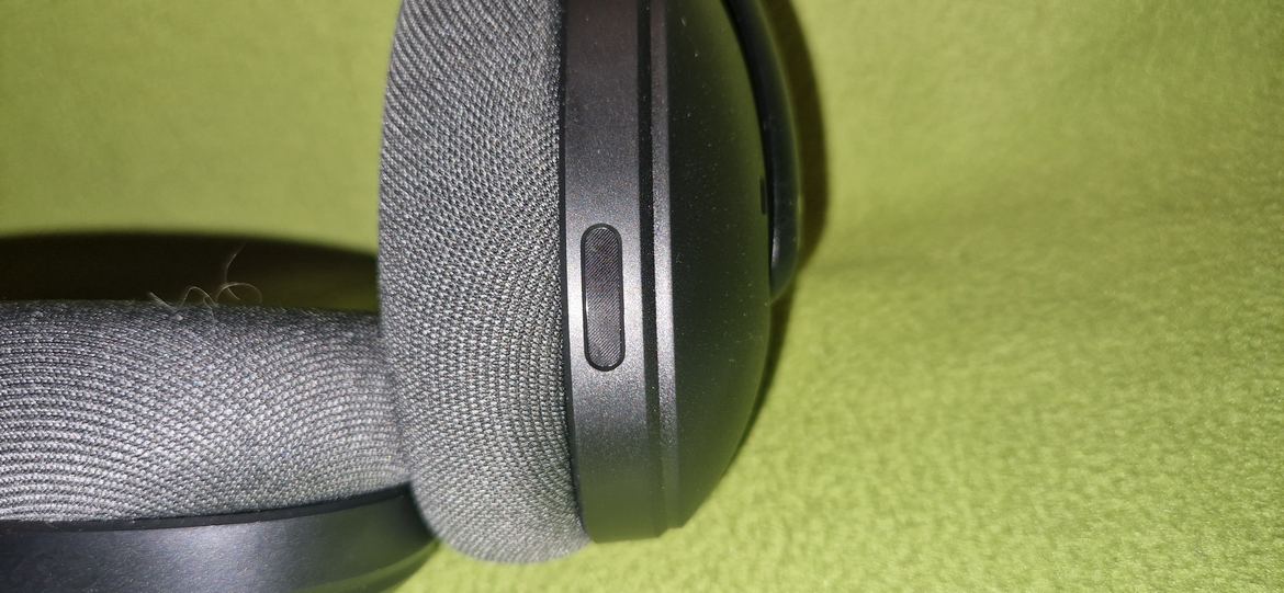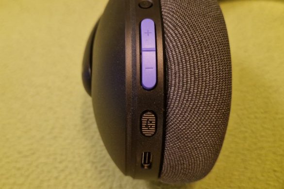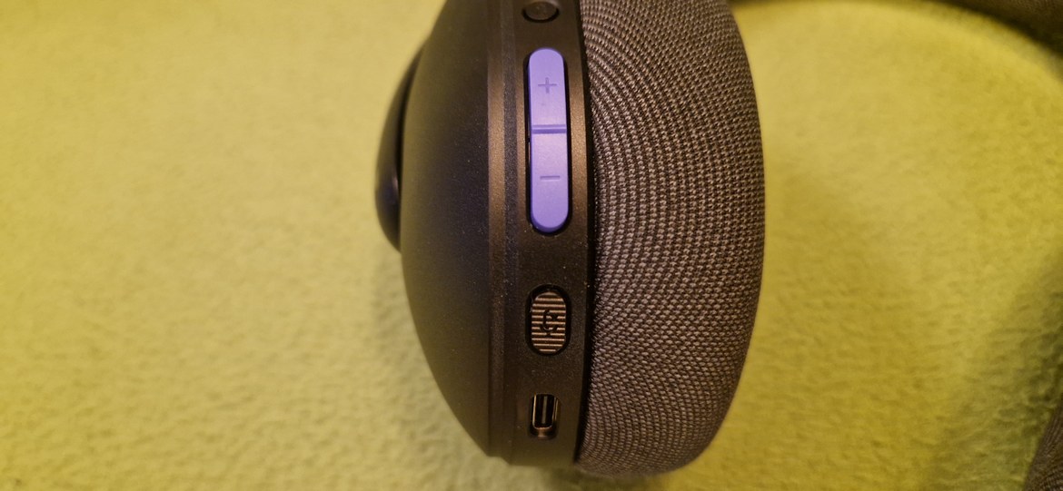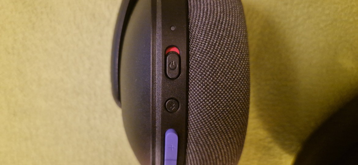 Ser vi till funktioner såsom knappar för volym och byte mellan LIGHTSPEED eller blåtand finner vi allt detta på baksidan av vänster öronkåpa. Överst av dessa knappar finner vi AV/PÅ-knappen, under den finner vi en knapp för att byta mellan LIGHTSPEED och blåtand. Sedan har vi den redan nämnda lila knappen för volymen och sista knappen är för att stänga av ljudet på mikrofonen.