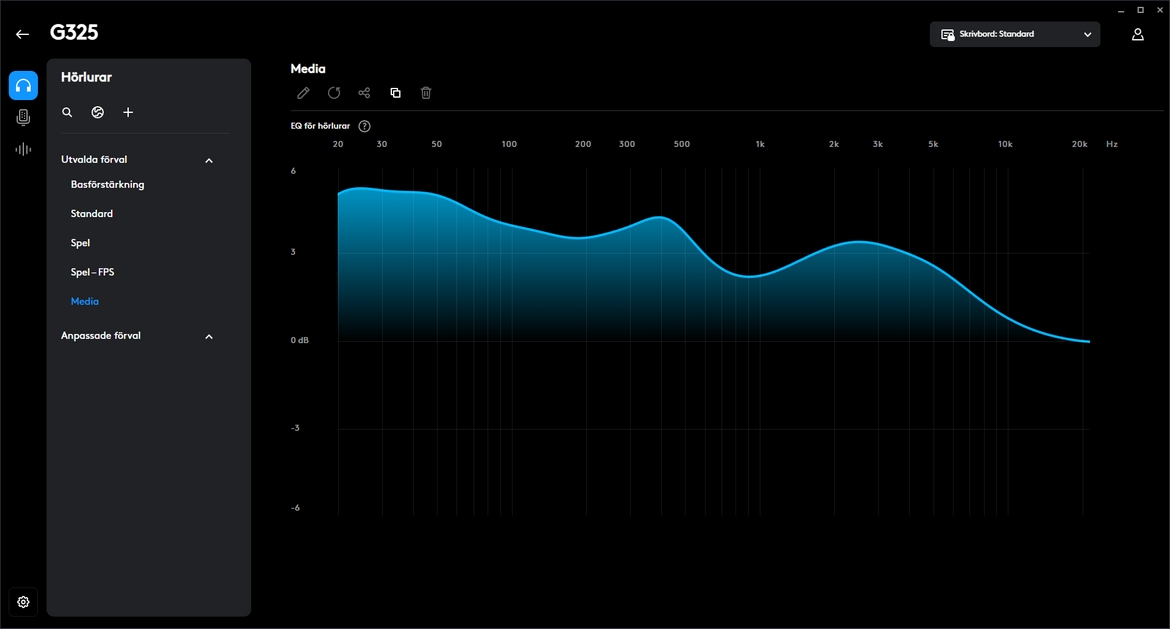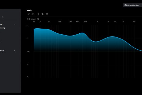 EQ-inställningar, använd en av de fem förinställda profilerna som t.ex. Basförstärkning, Spel eller Media. Du kan även ställa in och leka runt med en profil för att få till ljudbilden precis som du vill ha den.