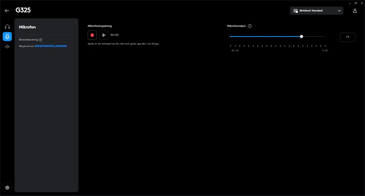 En sak som jag blev lite förvånad över var under samtal när jag sa att jag satt och använde G325. Då det ej lät som en svag, tunn ljudbild som vi vanligtvis förväntar oss. Här fick jag responsen att jag lät bra och tydligt – inte studiomikrofons ljudbild, men att det var långt över förväntan på vad vi vanligtvis får på ett budgetheadset. På mina egna tester kunde jag också höra att jag hördes tydligt och bra, visst har jag hört bättre ljud från en mikrofon, men då brukar det vanligtvis ha en siffra till i prisbilden. Överraskande och inte förväntat bra mikrofon är vad vi får kalla den helt enkelt. Något som också finns i programvara Logitech G HUB är att du kan slå igång AI-brusreducering, med andra ord den kommer försöka att filtrerar bort oljud runtomkring dig och fokusera att bara din röst hörs tydligt.