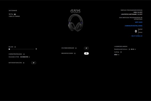 Som jag nämnde kan du se hur mycket batteritid du har kvar i programvaran, men jag tror nog att Logitech behöver uppdatera programvara, då som ni ser på bilden ovan har jag 99% batteri, men att det står cirka 59 timmar kvar. Detta är lite missvisande då detta gamingheadset bara har 24 timmars batteritid (vid ca 50% volym), men med det sagt har jag kunnat haft långa spelsessioner utan att tänka på att det snart är dags att ladda batteriet.