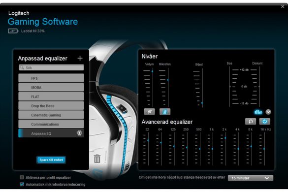 Sedan kommer vi till mjukvaran. Och ja, Logitech kan verkligen sina grejer. Har du Logitechs Gaming Software installerad, så kommer headsetet automatiskt hittas när du pluggar in USB dongeln. Sedan så är allt tydligt och enkelt tillhandahållet i programmet; batteritid, G-knapps kommandon, reglering av LED ljus effekter, Equalizer, och surroundljud reglage. Allt är smidigt och lättanvänt oavsett om du tidigare använt dig av Logitechs system eller inte.