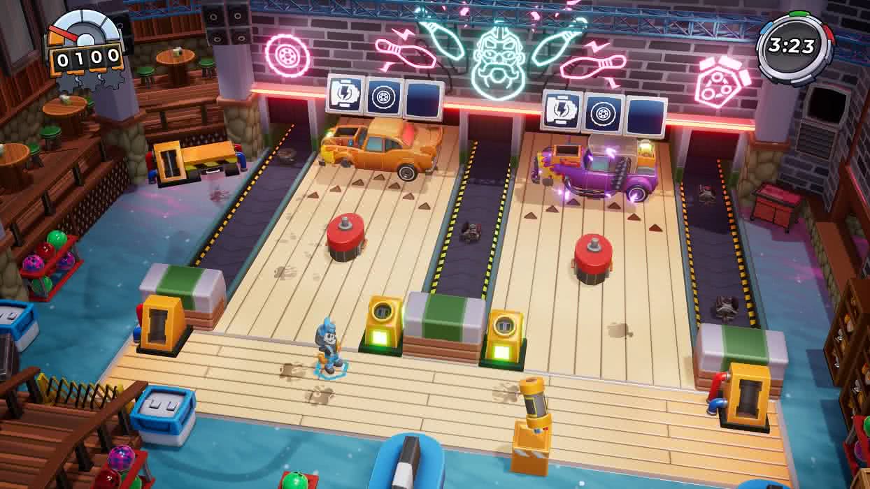 Det är inte ett svårt spel, även om de lägger till lite extra grejer för att göra nivåerna mer utmanande. Problemet jag har är den plötsliga orättvisa som sker när bossen kastar ett bowlingklot mot en bil så bildelarna jag har satt dit trillar av eller på andra sätt saboterar för mig. Men jag har spelat det här själv, och det är ett spel för flera spelare, så min upplevelse blir lite skev. Det finns ett onlineläge där du kan antingen hoppar in i en existerande lobby, eller skapar en egen lobby för flera spelare. Sen är tanken att ni tillsammans tar er an banorna och försöker reparera så många bilar ni kan innan tiden tar slut. Det finns även ett lokalt samarbetsläge, där konceptet är exakt detsamma, bara att ni alla sitter i samma soffa och spelar.