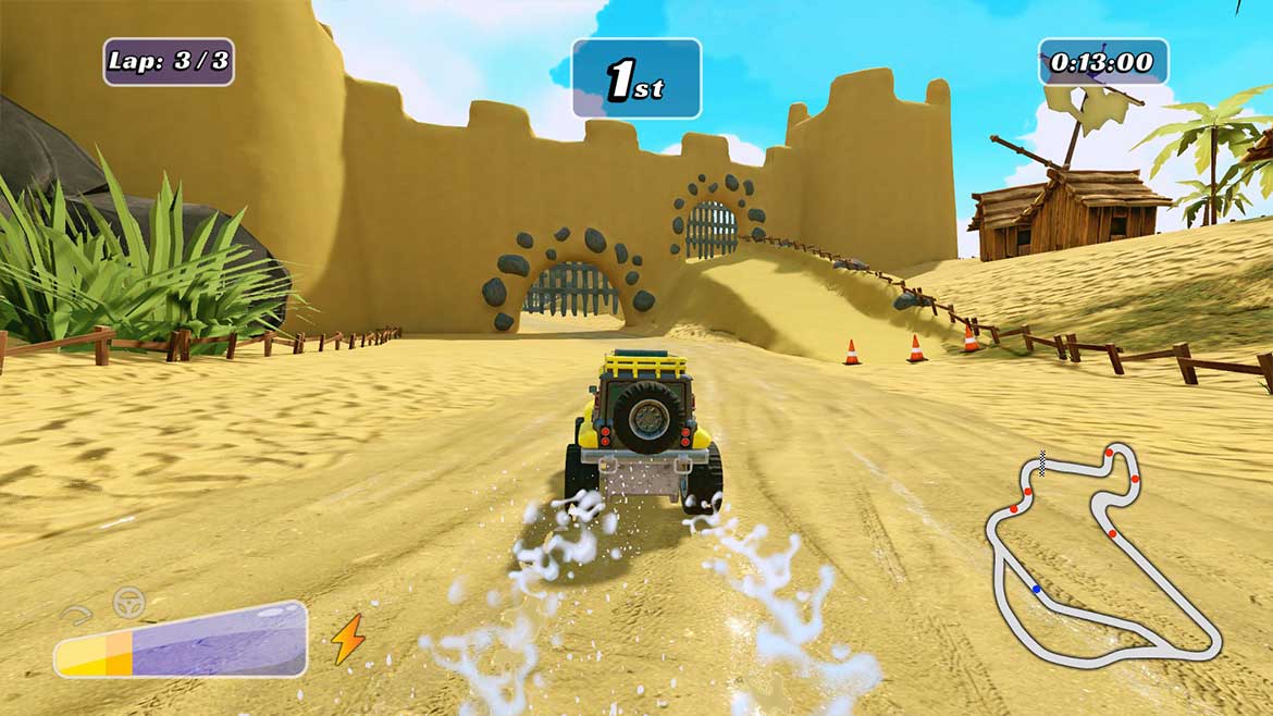 Spelet bjuder på en mindre mängd innehåll: 14 korta banor, 12 olika bilar och möjligheten att spela solo, online eller i split screen-läge. De två spellägena som erbjuds är Äventyr och Tävling. Den förstnämnda erbjuder en Super Mario-liknande värld där spelaren kan klara uppdrag – allt ifrån att vinna lopp till att leverera post – på förutbestämda banor. Banorna går snabbt att klara av och är inte tillräckligt underhållande eller varierade för att motivera en andra genomspelning. Enligt min upplevelse är äventyrsläget något man spelar en gång och sedan inte återvänder till. Om spelet gav möjlighet att välja olika bilar för uppdragen hade det kunnat ge mer variation, men som det är nu ligger spelets långsiktiga hållbarhet främst i tävlingsläget.
