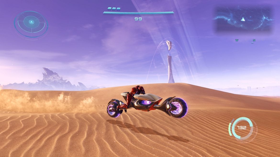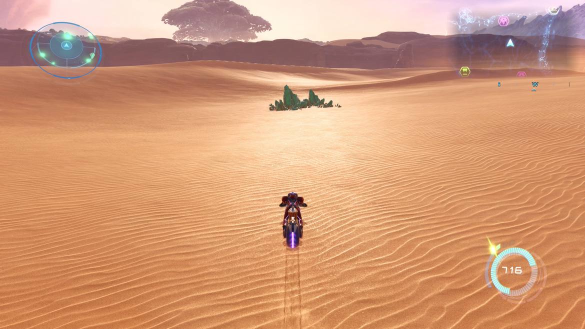 Nåja, sedan har vi öknen i sig, som verkligen inte fyller sitt syfte. Tanken om att ha en öppen värld, där du tar dig vart du vill skulle vara kul – särskilt om det fördes samman med Metroid Prime, men ack så torr (pun intended) den är. Det är ett visst antal tempel, några beståndsdelar av en stor robot och (i regel) två-tre variationer av fiender som hittas här. För att inte tala om gröna kristaller.