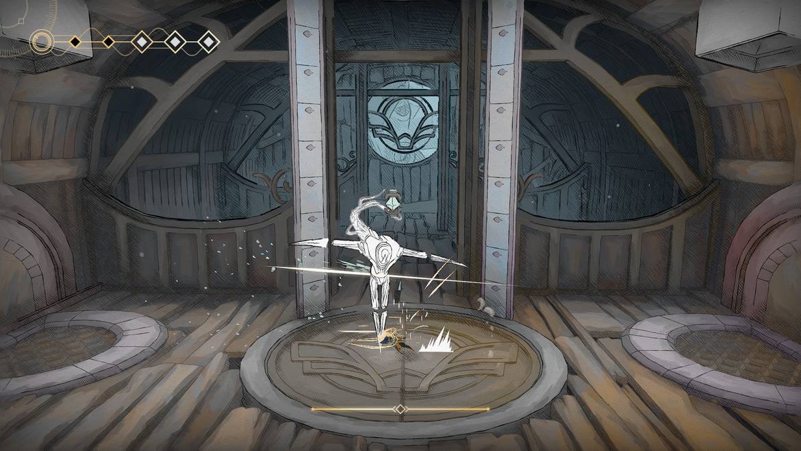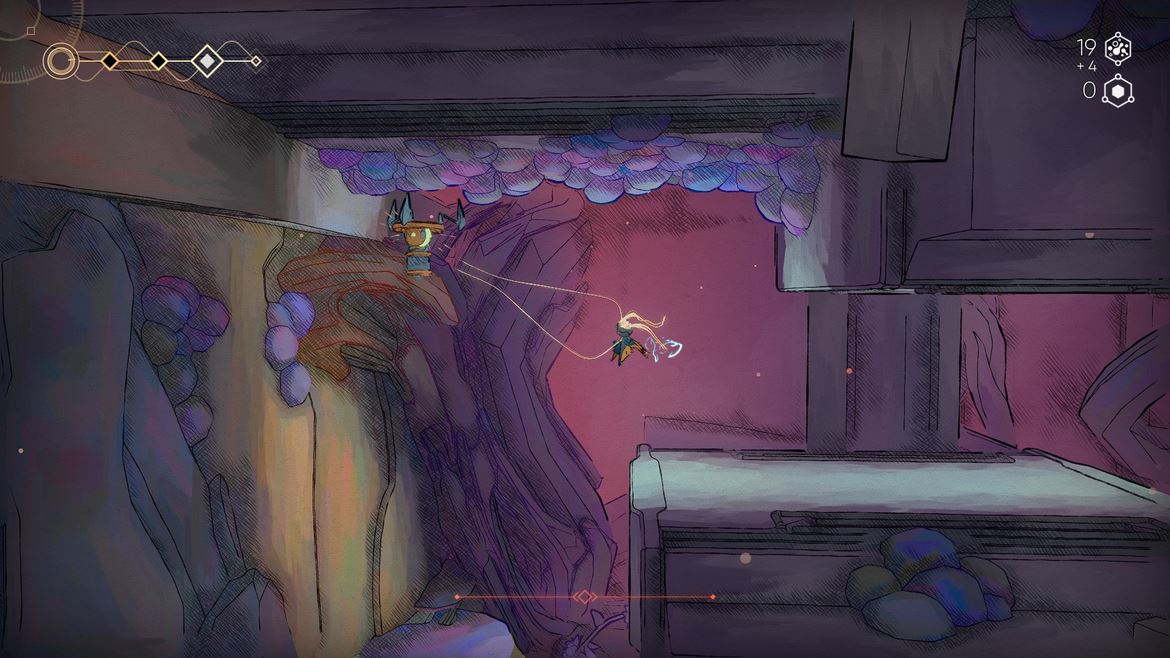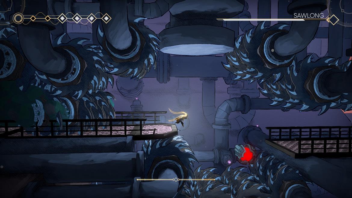 Vi lämnar konsten bakom oss och tittar på det som utgör det interaktiva mediet; kontroller och utmaningar. Kontroller och rörelse är en lätt och luftig variant med fullständig avsaknad av momentum – du stannar alltså när du släpper tangenten/knappen (förutom när du rör dig på is). Detta gör plattforming mycket pricksäker men räknar bort någon form av skön tyngd i din karaktär. Detta är ingenting som är ett minus för spelet dock, endast ett designval från utvecklarna som avgör hur bandesignen är upplagd. Ingen fallskada heller. Hopp och dubbelhopp får du från början och kort därefter en dash-förmåga där Mio slänger ut sina mekaniska spröt för att greppa tag och agera slunga som kallas för ’’Hairpin’’. Denna förmåga använder du oerhört mycket genom spelet för allmän förflyttning och strid, men kräver energi för att utföra – liksom alla andra handlingar som kommer senare.
