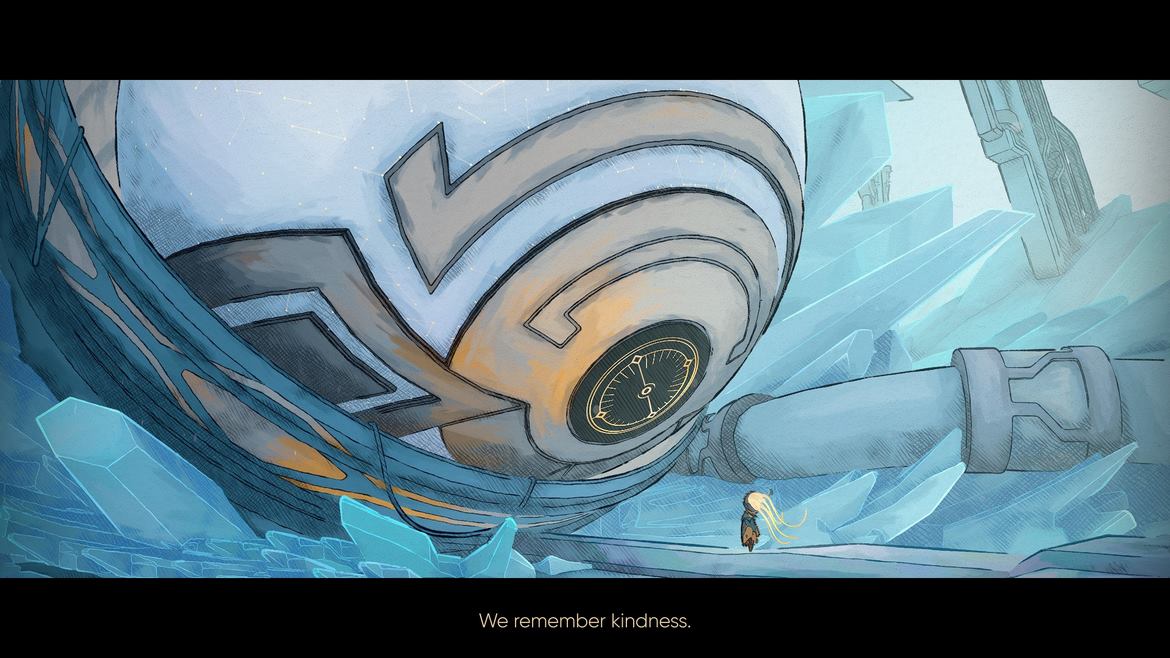 Det visuella är minst sagt häpnadsväckande. Färgernas indelningar inom både bakgrund och förgrund utgör sig både tydliga och stämningsgivande med tydligt fokus att efterlikna vattenfärger. Mycket av detta kan vi också tacka de typiska hårdragna linjerna i cel-shaded-stilen som kontrasterar dimensionerna. Allt detta ger en stark vibb av expressionistisk futurism med enorma, ståtliga former och invecklade mönster. Mio: Memories In Orbit använder tredimensionella ytor i sin illustrering men begränsar rörelseytan till en tvådimensionell likt många andra i samma genre. Dock kan vi se saker röra sig in och ut ur perspektivens djup och vissa panoraman har så detaljerade bakgrunder att det tar andan ur dig. Färgtematiken för alla olika ytors biomer är stilistiskt välavvägda och gör alla olika områden distinkta med sina egna färger. Jag trodde aldrig att jag skulle kunna urskilja så pass många olika nyanser av ljusblått som jag gjort i detta spel, men på något sätt lyckas de lyckats balansera allt på ett häpnadsväckande sätt.