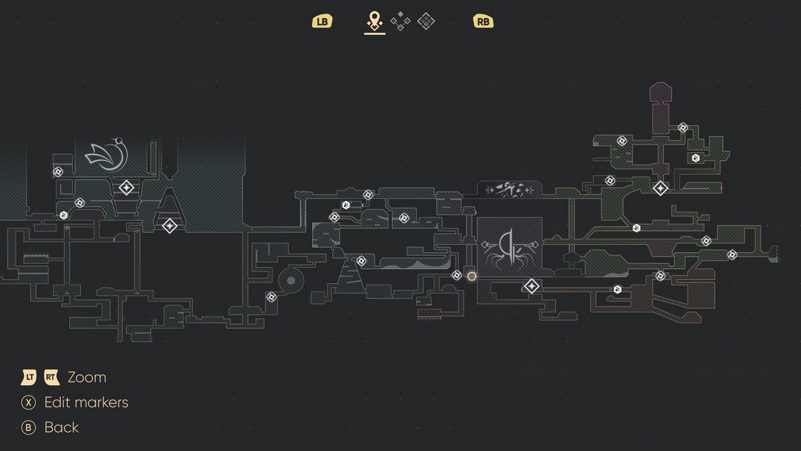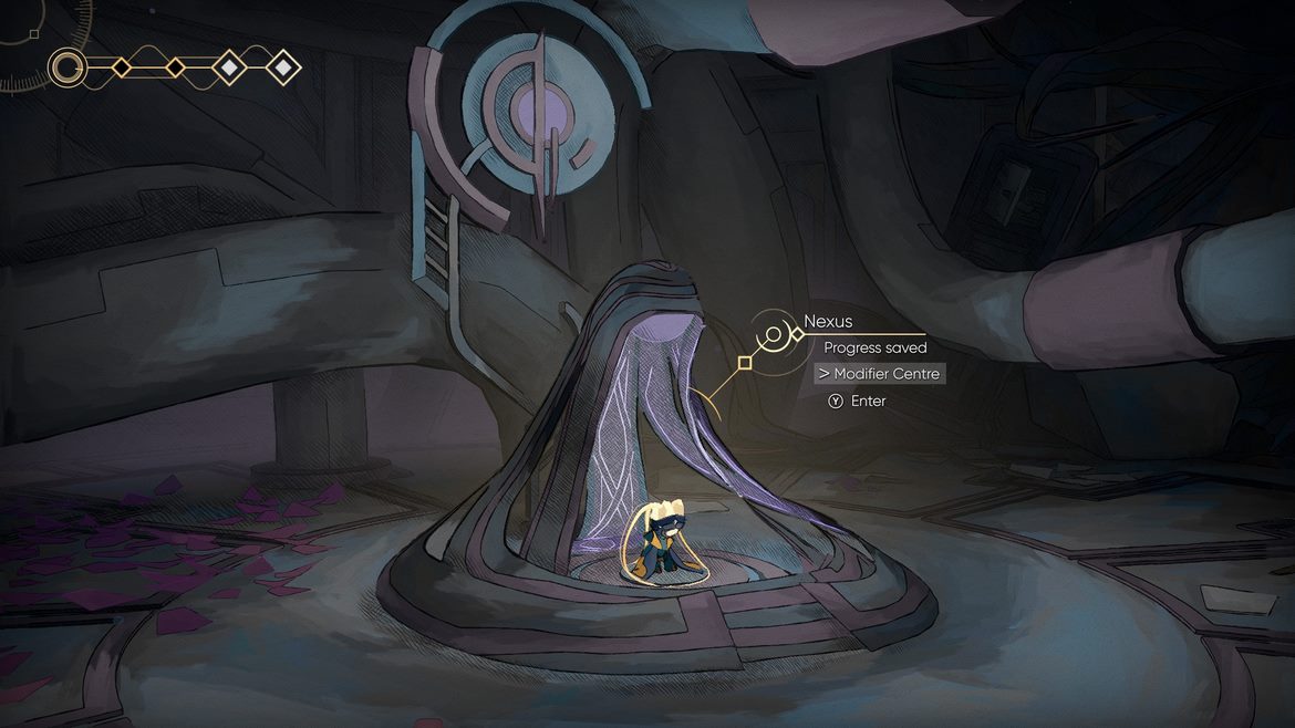 Mods är uppgraderingar du bara kan bära i begränsad mängd och Old Cores är en annan ovanligare valuta som används i affären för att köpa uppgraderingar, så som coating components som ökar din hälsa en poäng om du fixar fyra. Det är med detta också som bandesignen skiner med sina finurligt välgömda hemligheter, strukturerad enligt en tacksam metroidvania-stil som hela tiden får dig att tänka ’’Jag behöver en annan form av rörelsehandling för att komma dit’’ samtidigt som den bitvis belönar dig med mindre gömda hemligheter och genvägar att låsa upp. Det ger en ständig känsla av investering då vi hela tiden har dessa i bakhuvudet, handlingen av att låsa upp en ny rörelse blir än mer tillfredställande.