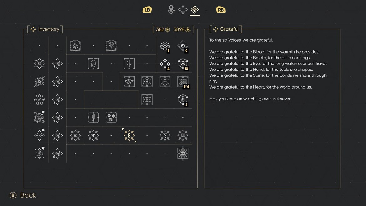 Som sista fokuspunkt ska vi kika lite på några av de vanligare tendenser genren brukar ha och vad Mio: Memories in Orbit gör med dessa – valuta, uppgraderingar och hemligheter. Valutan hete Nacre och denna får du en skvätt av varje fiende du besegrar. Den kan du delvis använda i Nacre Basins för att få tillbaka lite av din hälsa som kallas för Protective Layers. Hälsan i sig är mycket begränsad och i början av spelet kan du endast ta 3 träffar innan du går ned. Dock finns dessa Nacre Basins lite kringströdda i spelet övervärld och kostar endast 10 Nacre för dig att få tillbaka en Protective Layer, så det är inte lika bestraffande som det kan låta (detta ökar dock till 15 och 20 i senare segment). När vi dör släpper vi alla resurser och i motsats till det förväntade kan vi inte plocka upp dem i liknande stil som Hollow Knight. Däremot kan vi hitta maskiner som gör Nacre till Solidified Nacre, vilket behålls även efter döden. Dessa, på liknande sätt som Nacre Basins finns lite här och där.