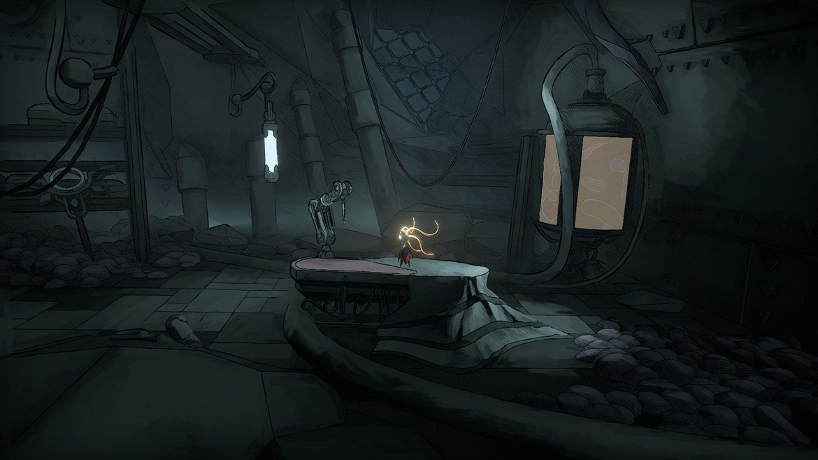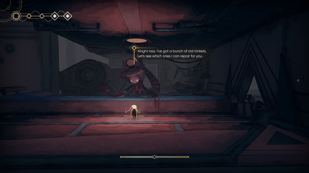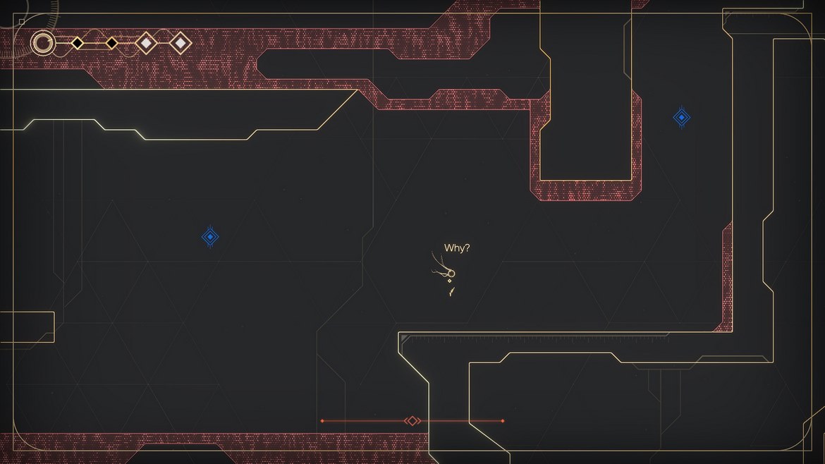 Vi börjar med att nämna berättelsen utan att gå in för djupt på detalj, vi vill ju inte avslöja för mycket. Vi tar rollen som Mio, en söt liten robot med långa, gula sonder som kan liknas till hennes hår. Allt startar med att vi blir igångsatta av en annan robot som liknar en variant av en dolksvans, sedan är det bara att börja göra sin väg framåt. Eller sidledes som genren kräver. Väldigt snabbt börjar vi dock förstå att allt inte är som det borde, vi utsätts för ett starkt systemfel som nästan stänger av Mio igen och efteråt har vi förlorat ett av våra hälsopoäng permanent. Någonting är väldigt korrupt i programvaran. Med detta kanske ni förstår att berättelsen är en sådan som inte förmedlar allt på en gång för spelaren, utan gör sig bäst av att hålla spelaren fundersam och gissande. Det ger oss ett narrativ av ständig utforskning och mysterium som är en fullständig fröjd att få ta sig igenom.
