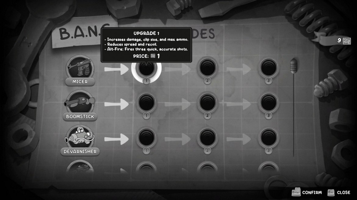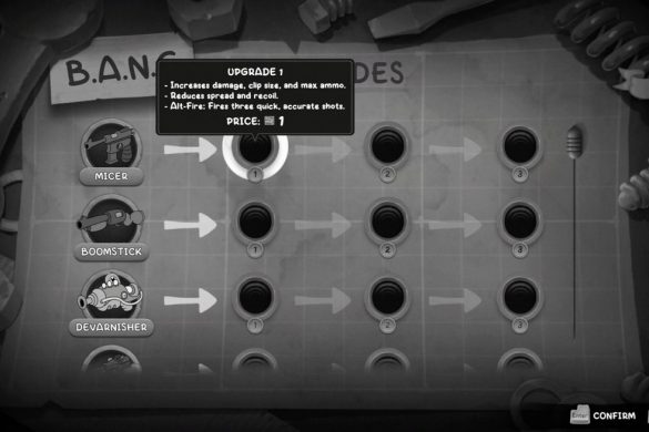 Mellan banorna kan vi utforska de olika faciliteter Mouseburg har att erbjuda. Bland annat kan vi gå till ingenjören Tammy som kan uppgradera våra vapen. Genom att hitta ritningar (en gemensam resurs för uppgraderingar) kan du förbättra dina vapen i tre steg. Upgraderingarna påverkar bland annat hur starka vapnen är och hur mycket ammunition du kan ha åt gången. Jag uppskattade detta. Även om det är ett relativt enkelt system ger det belöning till den som går bortom den givna stigen. Dessa ritningar finns ofta i dolda kassaskåp på banorna som kräver ofta att du utför ett låspussel, där du guidar en skiftnyckel likt Snake. Här är det viktigt att du nuddar alla noder som sticker ut längs vägen. Senare i spelet innehåller några av dessa lås även spikar du måste undvika. Allt medan du arbetar under tidspress. Det är dock svårare sagt än gjort då jag inte fann några av dessa pussel allt för komplexa.