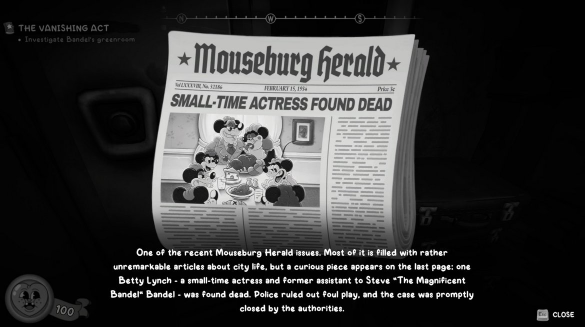 Vi spelar som privatdetektiv Jack Pepper (röstad av Troy Baker, känd bland annat som som roll som Joel i The Last of Us), och året är 1934 i den stämningsfulla staden Mouseburg. Efter ett storskaligt krig är de enda som finns kvar i staden antropomorfiska (människolika) möss. Berättelsen börjar med att en uppdragsgivare, Wanda berättar att Steve Bendel (en före detta krigskämpe som blivit scenmagiker) spårlöst försvann under sin senaste show. Under utredningen räddar Jack politikern Cornelius från lönnmord och i gengäld ger han Jack en en nyckel till Steves labb. När Jack kommer dit inser han att labbet är fullt av kultister och anteckningar om snedsteg i i ett projekt kallat ”The Unknown” efter Steves assistent Bettys död. Vad innebär detta projekt och vad är Steves egentliga intentioner? Ja, den som spelar får se!