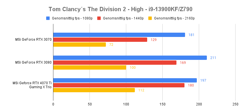 För varje spel gjordes tre omgångar av benchmarks per grafikkort – plus att MSi Geforce RTX 4070 Ti Gaming X Trio fick ytterligare en omgång, då det har två uppsättningar av drivrutiner vi testat med. Den samlade datan kan ses nedan, och är resultatet av omgångarnas resultat i genomsnitt sett till bilduppdateringsfrekvens (fps).
