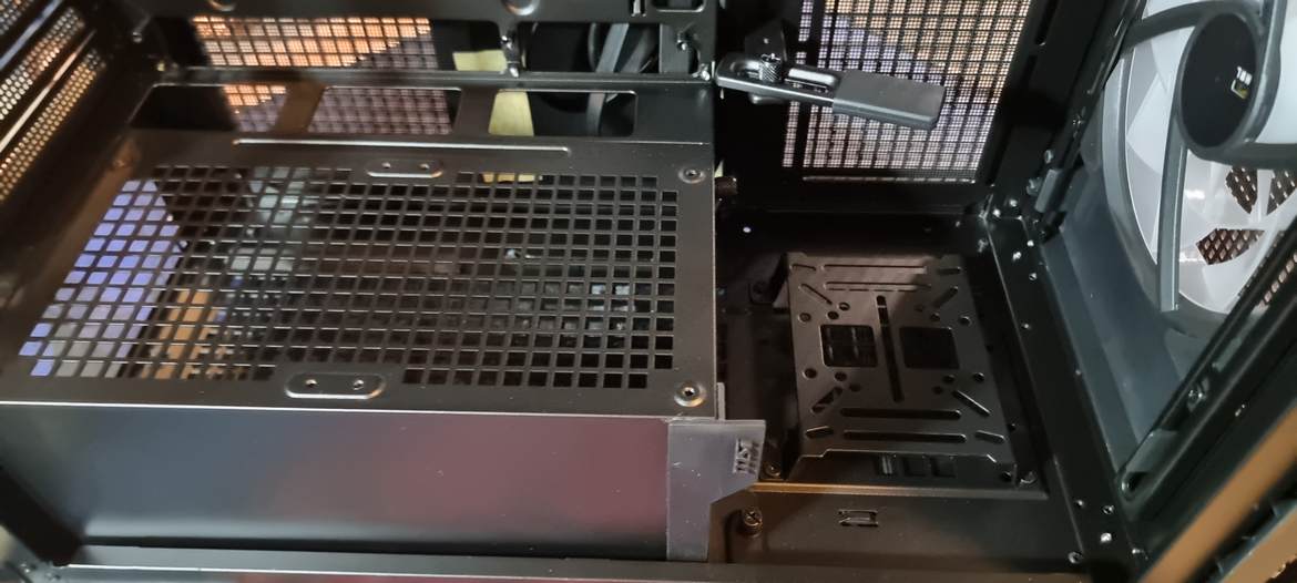 Till höger. Underst PSU-område. Ovan plats för lagring. Till vänster för ytterligare AIO-radiatorsupport.