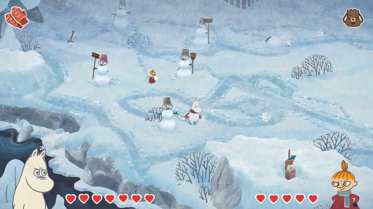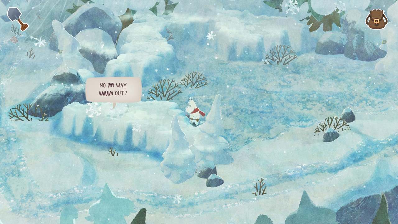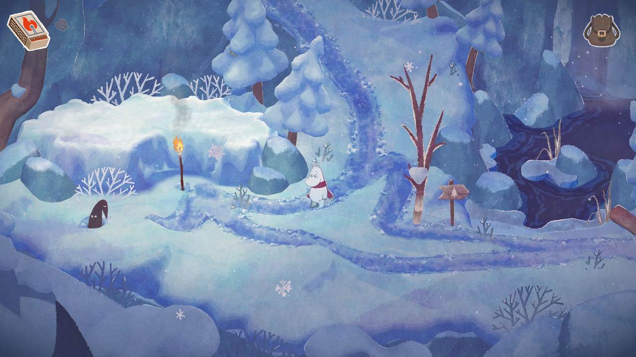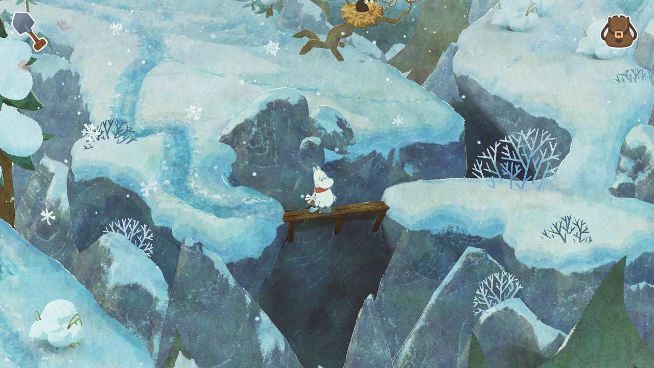 Dessvärre blev det ganska snabbt tydligt för mig att Vinterns värme inte riktigt lever upp till nivån satt av föregångaren. Det blir aldrig en särskilt intressant summa av kardemumman. Utöver estetiken som i sig förhöjer upplevelsen en hel del lyckas inget annat riktigt imponera på mig; snarare frustrera. Kanske är det hela tänkt att vara designat som någons första steg in i en mer eller mindre öppen värld. Vi får nämligen chansen att utforska en stor del av den snöprydda Mumindalen lite efter vårt eget bevåg, på sätt och vis. Vissa platser är blockerade med fallna stockar (en så stor mängd till och med att jag började fundera på vem som ansvarar för slyrensning i dalen och att de gjorde ett hemskt jobb under hösten), stora snöhögar, eller liknande som alla kräver sina egna verktyg för att hanteras. En yxa (som enligt min mening introduceras alldeles för sent) för stockarna, en skyffel för snön, etc. Föregångaren hade liknande element, men av någon anledning funkar det bara inte för mig här.