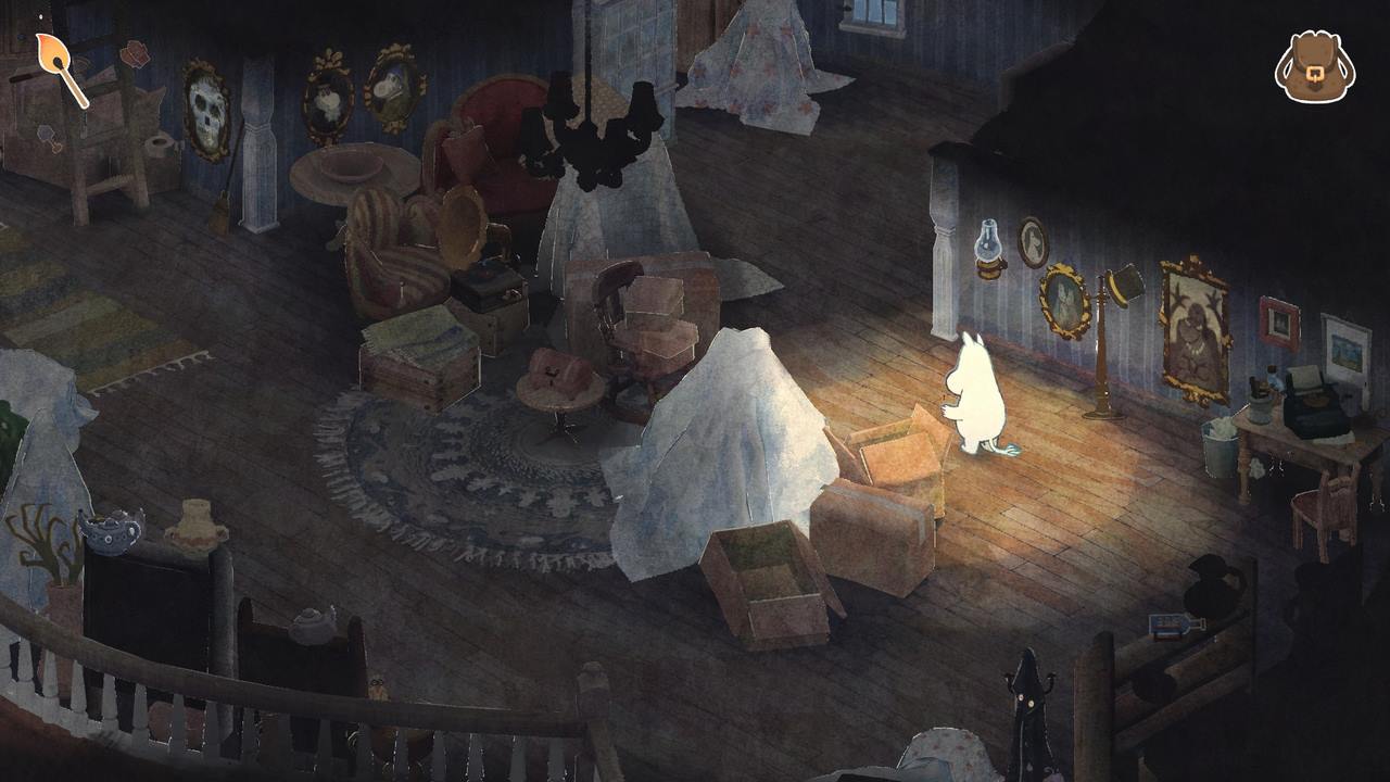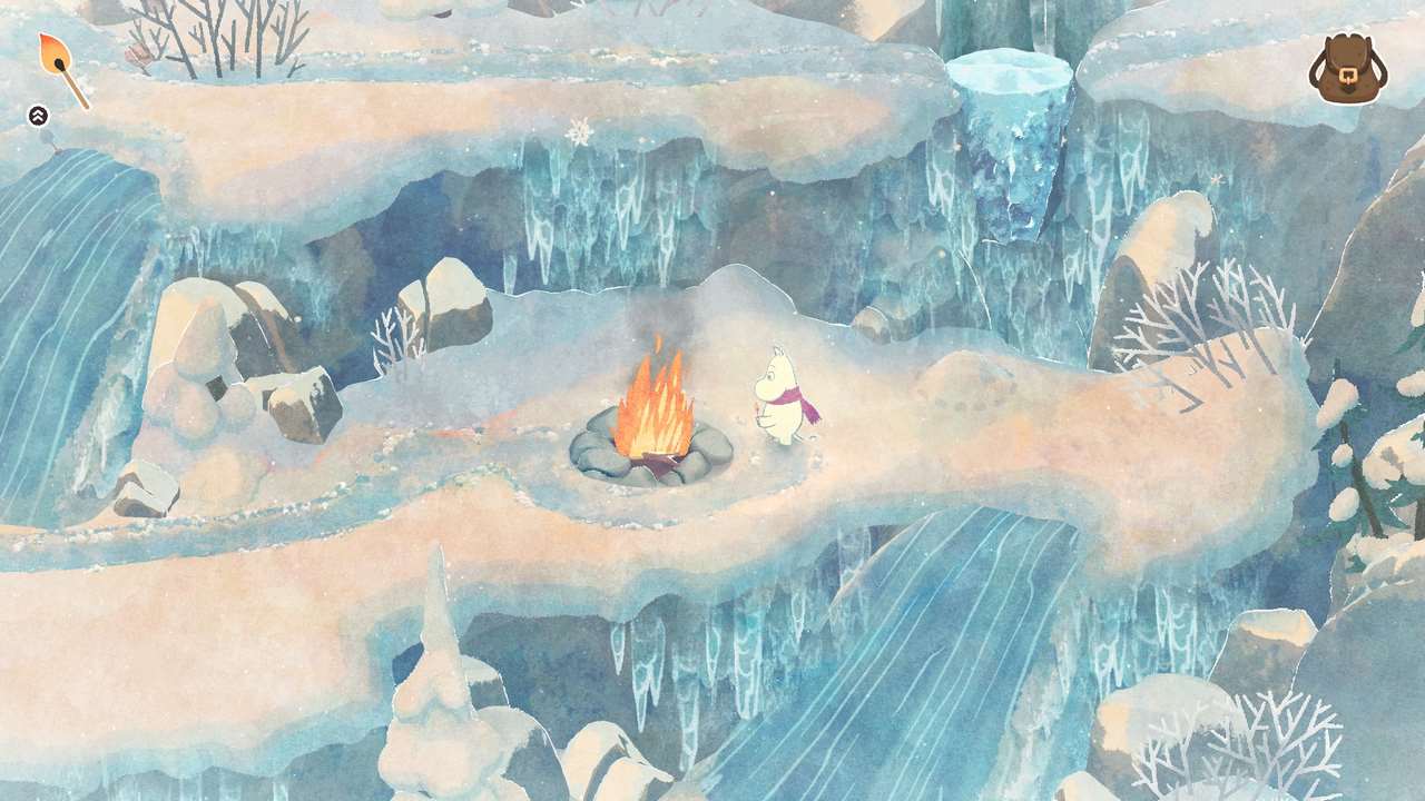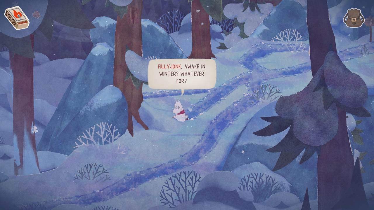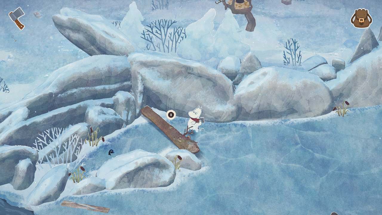 Dessvärre blev det ganska snabbt tydligt för mig att Vinterns värme inte riktigt lever upp till nivån satt av föregångaren. Det blir aldrig en särskilt intressant summa av kardemumman. Utöver estetiken som i sig förhöjer upplevelsen en hel del lyckas inget annat riktigt imponera på mig; snarare frustrera. Kanske är det hela tänkt att vara designat som någons första steg in i en mer eller mindre öppen värld. Vi får nämligen chansen att utforska en stor del av den snöprydda Mumindalen lite efter vårt eget bevåg, på sätt och vis. Vissa platser är blockerade med fallna stockar (en så stor mängd till och med att jag började fundera på vem som ansvarar för slyrensning i dalen och att de gjorde ett hemskt jobb under hösten), stora snöhögar, eller liknande som alla kräver sina egna verktyg för att hanteras. En yxa (som enligt min mening introduceras alldeles för sent) för stockarna, en skyffel för snön, etc. Föregångaren hade liknande element, men av någon anledning funkar det bara inte för mig här.
