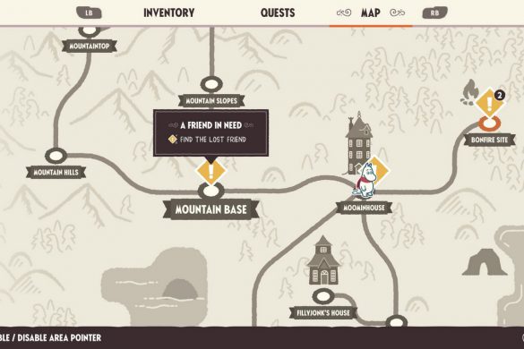 Tyvärr finns det annat som talar för att mycket av det inte handlar om att presentera en ny spelare för den här typen av genre eller mekaniker. Ett par sektioner av kartan är chockerande tomma, men måste fortfarande navigeras flera gånger. På sin höjd måste en snödriva röjas undan, antingen för att ta sig vidare, eller för att hitta något som gömts på marken. Här och där kommer ett annat verktyg behövas, men t.ex. yxan som krävs för att röja undan fallna stockar eller fälla träd tillkommer som sagt frustrerande långt in för att inte bli en långvarig underliggande irritation. På det stora hela känns områdena mindre som en gosig walking simulator (vilket säkerligen hade irriterat många bara det) och mer som ett sätt att dra ut på tiden. Visst att en del genvägar kan låsas upp efter första rundan, men det underlättar endast en bråkdel av den monotona känslan som redan då infunnit sig.