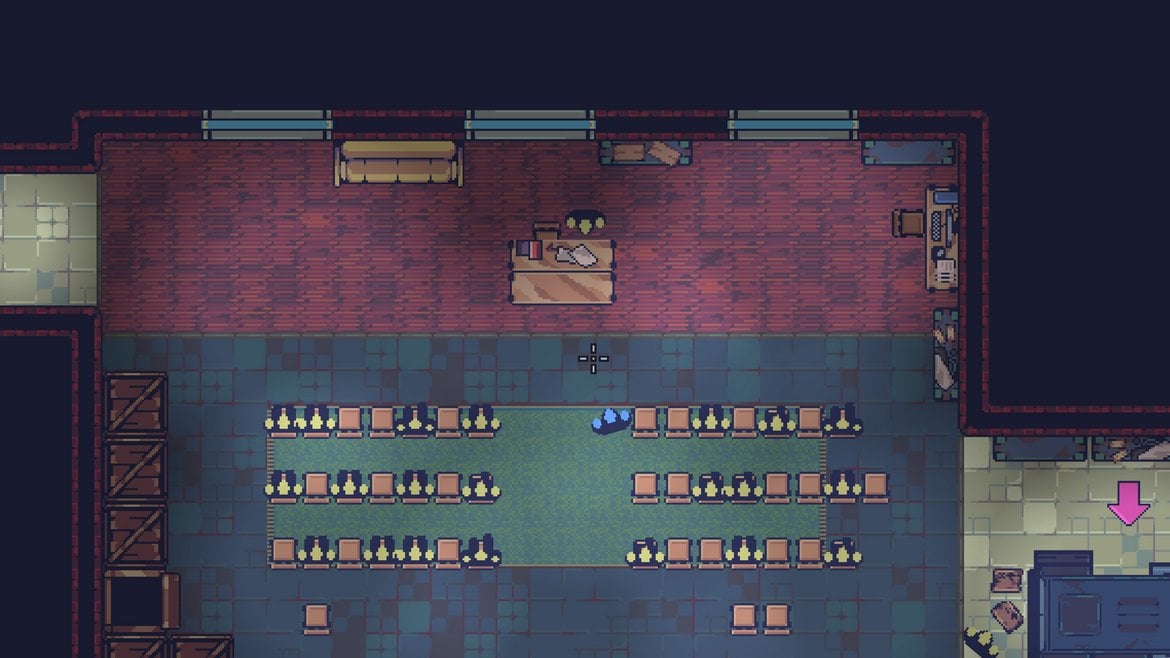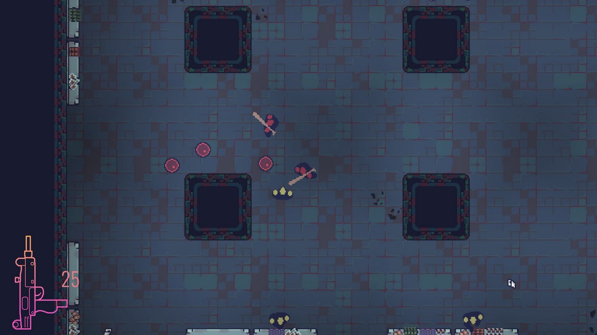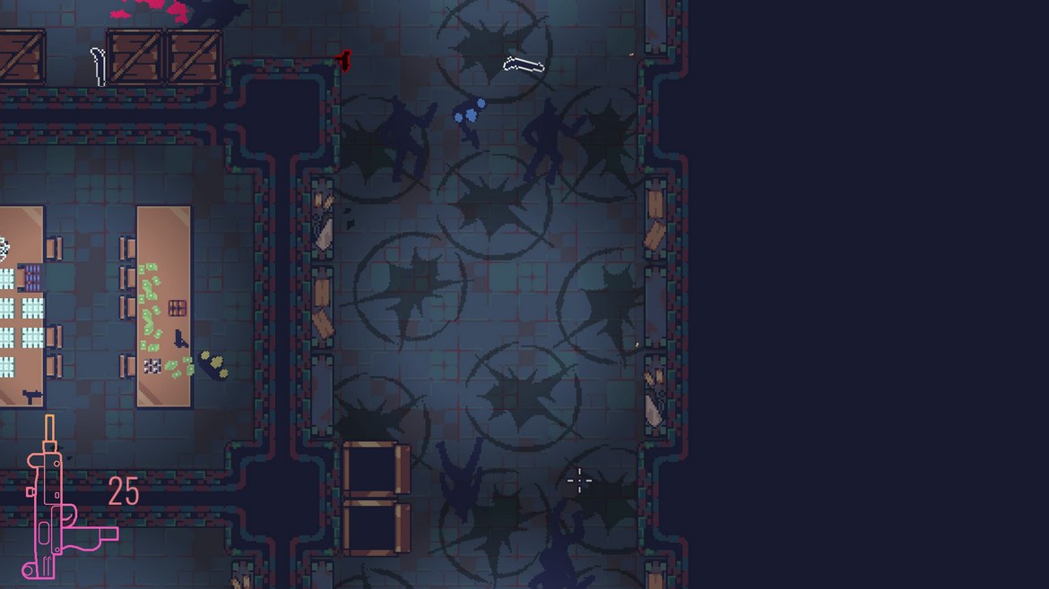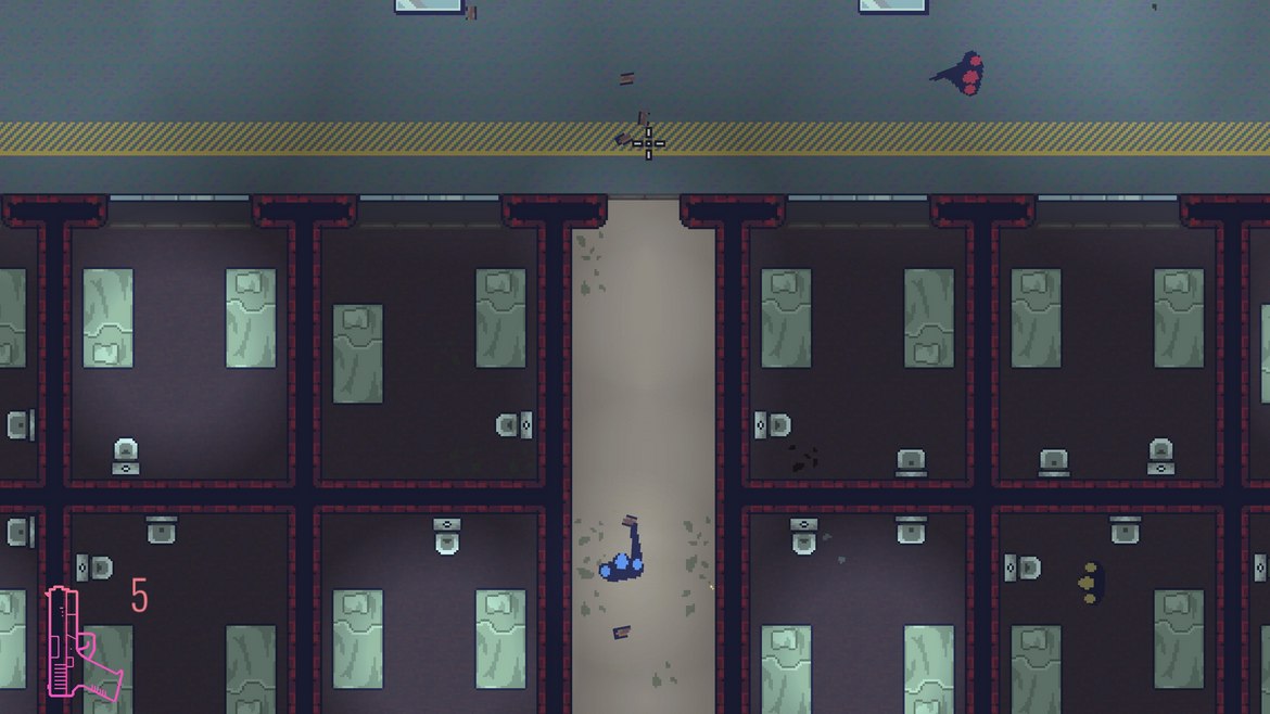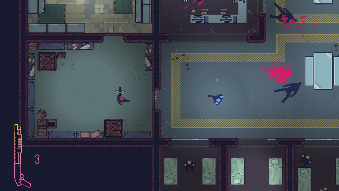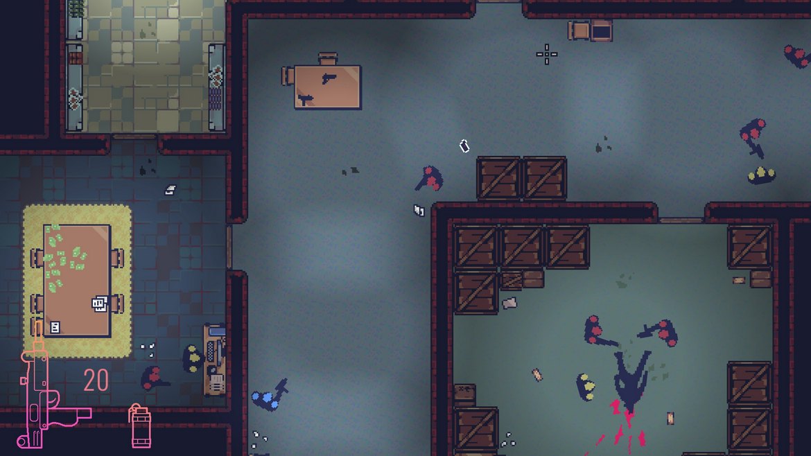 Efter detta är det samma sak igen. Och igen. Och igen. Det upprepar sig i all oändlighet och trots att det stundtals kommer lite små skillnader i bandesign och fiendedesign, är spelet oerhört tröttsamt. Banorna följer samma mönster. En korridor som öppnas upp till ett rum som i sin tur har dörrar och dessa dörrar leder till andra rum. I rummen står det fiender. I början har de pistoler och basebollträ, men ju längre in i spelet du kommer desto fler vapentyper kommer det att finnas. Allt från pistoler till snipergevär. Det enda som ändras med banorna är layouten. Någon har två rum på varsin sida av banan och öppet i mitten, andra har många små rum. Resten är beständigt. Jag får intrycket av att Sometimes You har köpt ett enda texturepack för spelet och sedan använder de det tills ögonen blöder. Det är mest brunt, grönt och ibland blått. Allting är smutsigt för att inte tillföra någon direkt färg i världen. Förutom de enorma pölarna av blod som uppstår när du skjuter fienderna. Allting i någon slags pixeldröm och retrokänsla. Nog om djävulens stylist — låt oss prata om ljudet!