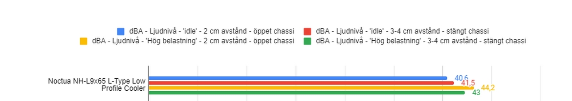 Ser vi till ljudnivåer får vi en godkänd, men avslagen sådan. Nu har vi en liknande fläkt som med NH-L9i-17xx chromax.black, därför är det inte allt för överraskande egentligen. Med 40,6 dBA under normal användning är det tystlåtet, men vi har sett denna nivå hos andra kylare. Det kommer duga alldeles utmärkt, och för dagligt bruk kommer du knappt märka av att datorn är igång – och är det som så att du låter processorn svettas extra mycket – under någon form av tung belastning – är den inte så värst ljudlig då heller.