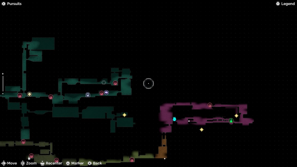 Allting låter väl ändå ganska rättframt och okomplicerat va? Jo då på pappret är det inga konstigheter alls, det är väl bara att springa till dessa dummingar, ge dem på nöten och sno deras ögon? Den här tanken är inte fel i sig, men det finns ett bekymmer. Detta är som sagt ett Metroidvania-spel. Vad det innebär är att vi får en karta. Till en början ser vi bara en liten fyrkant, men ju fler rum vi besöker, desto mer av kartan får vi se. Vi ser markörer i form av ögonglober som visar vart vi behöver ta oss, för att möta tidigare nämnda dummingar. Problemet är att det givetvis inte är raka vägen till målet, i den här typen av spel. Vägen kan vara blockerad av barriärer eller ett annat hinder, som du behöver en särskild förmåga för att klara av. Det kan också bara vara av den enkla anledningen att personen som designade byggnaden tyckte att; “på just den här platsen tycker jag att vi ska ha en vägg.” Det gäller alltså att utforska varje rum så mycket vi kan, för att ta oss framåt, eller i alla fall försöka få oss något steg närmare slutet i alla fall.
