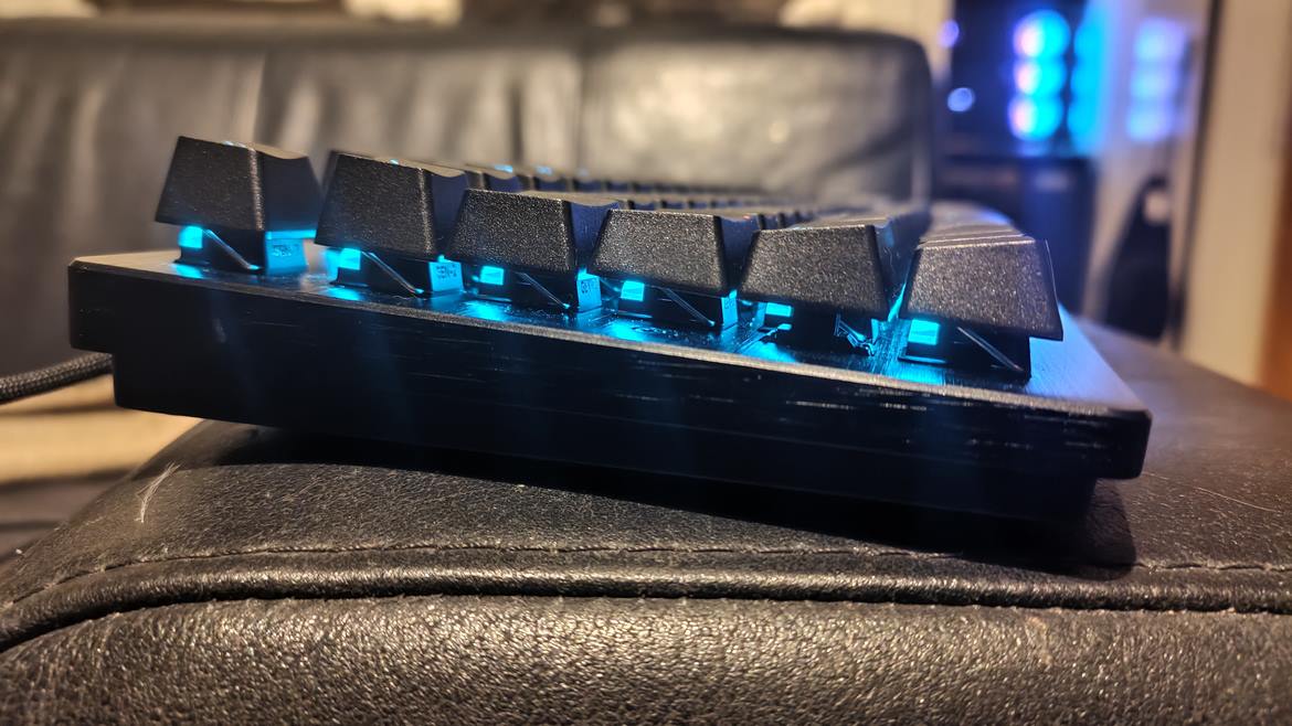 I skrivande stund har jag ställt in lägsta aktiveringspunkt (4 mm) och jag måste erkänna att det är ganska skönt att inte råka komma åt någon tangent i onödan. Jag skriver ofta ganska slarvigt och snabbt, framförallt på tangentbord som denna med brytare som har en lätt aktiveringskraft på 40 gram. PBT-plast emot fingertopparna är alltid en fröjd och är ingenting jag kan klaga på, grynigheten är precis tillräcklig för att vara skön och inte störande. Dock finner jag knapphattarnas skålning vara en aning djup och gör att fingrarnas manövrering blir bitvis hindrad av tangenternas kanter under hetsig skrivning.
