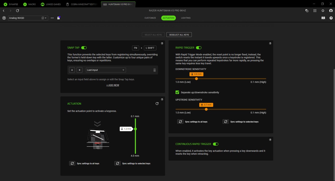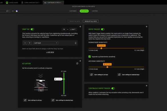 Exempelvis kan vi mycket noggrannare ställa in aktiveringsdjup med en reglagedifferens på 0.1 mm. Detta gäller även med återaktiveringshöjden för både upp och nedåtrörelse. Det är en hissnande pricksäkerhet vi kan komma åt här och passar sig mycket väl för entusiasten som vill testa till sitt hjärtas fröjd. Vi kan även anpassa beteendet gällande Snap Tap funktionen om vi vill att den ska prioritera vissa riktningar och med vilken tangent som gäller. Du kanske vill ha någonting annat än WASD?