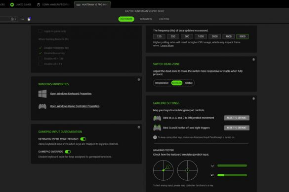 Razer erbjuder två program att leka med, Razer Synapse och Razer Croma – ene för funktioner och andra för RGB. Jag har varit i kontakt med båda tidigare och har god inställning till dessa, de är både tydliga och lätthanterliga med djup anpassningsförmåga. Tangentbord är nog det tillbehöret vi kan utöka mest, vilket jag fått doppa tårna i ordentligt. I föregående stycken uppmärksammade jag flertalet av inställningar och de går ännu bättre att anpassa dessa härifrån än snabbkommandon.