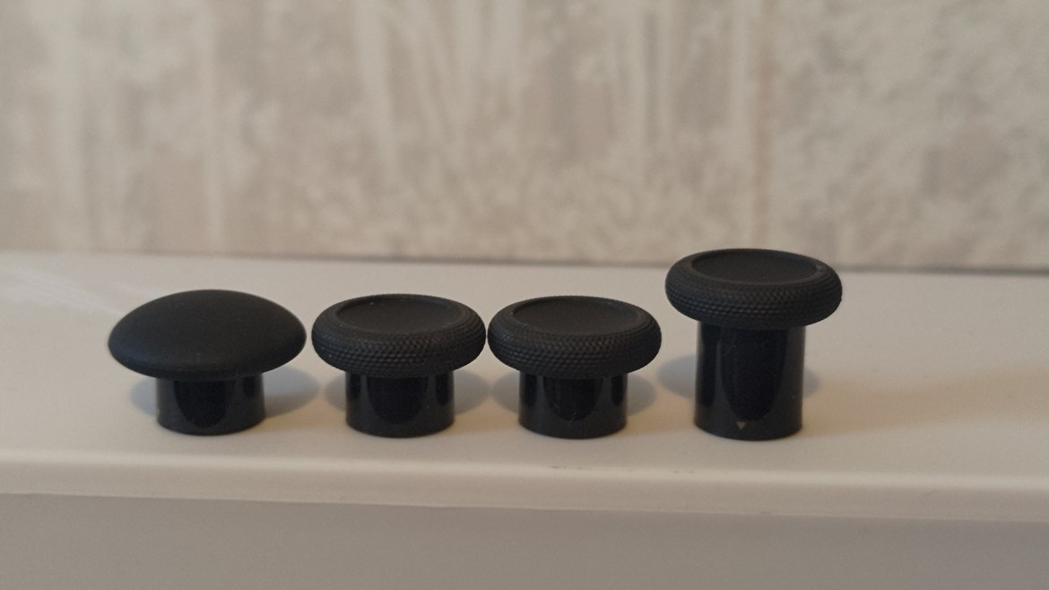 Utöver dessa har vi även två extra utbytbara hattar till spakarna där ene är en halv centimeter högre än de två standardhattar som ligger på 1cm, samt en med samma längd fast med konvex design istället för konkav (utböjd istället för skålad). Utbytbarheten av gummistöden är extremt lätt, det är bara att ta, dra och placera. Spakhattarna satt däremot ganska hårt i början och gjorde mig nervös att jag skulle ha sönder någonting. Men efter lite bök så fick jag loss hatten och kunde därefter placera som jag ville. Det var som att skaftet nöttes in lite, då detta blev lättare att göra efter några gånger.