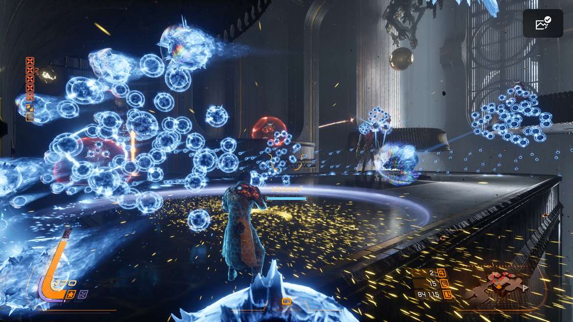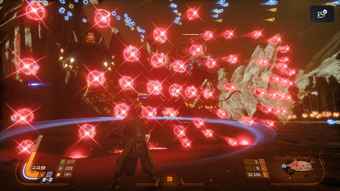 Bossarna är utan tvekan några av spelets absoluta höjdpunkter. De är aggressiva, visuellt slående och ibland fullständigt kaotiska. Projektiler fyller skärmen i rena mardrömsscenarion samtidigt som monstruösa fiender byter attackmönster mellan flera olika faser. Men trots intensiteten finns det nästan alltid en logik bakom kaoset. När du väl lär dig rytmen i striderna förvandlas de från omöjliga väggar till nervkittlande tester av fokus och tålamod. Problemet är bara att vägen tillbaka till en boss kan ibland vara lång, vilket gör att du får väldigt lite faktisk träningstid mot dem innan du kastas tillbaka till början igen. Samtidigt förstärker det också känslan av desperation. Varje försök känns viktigt.