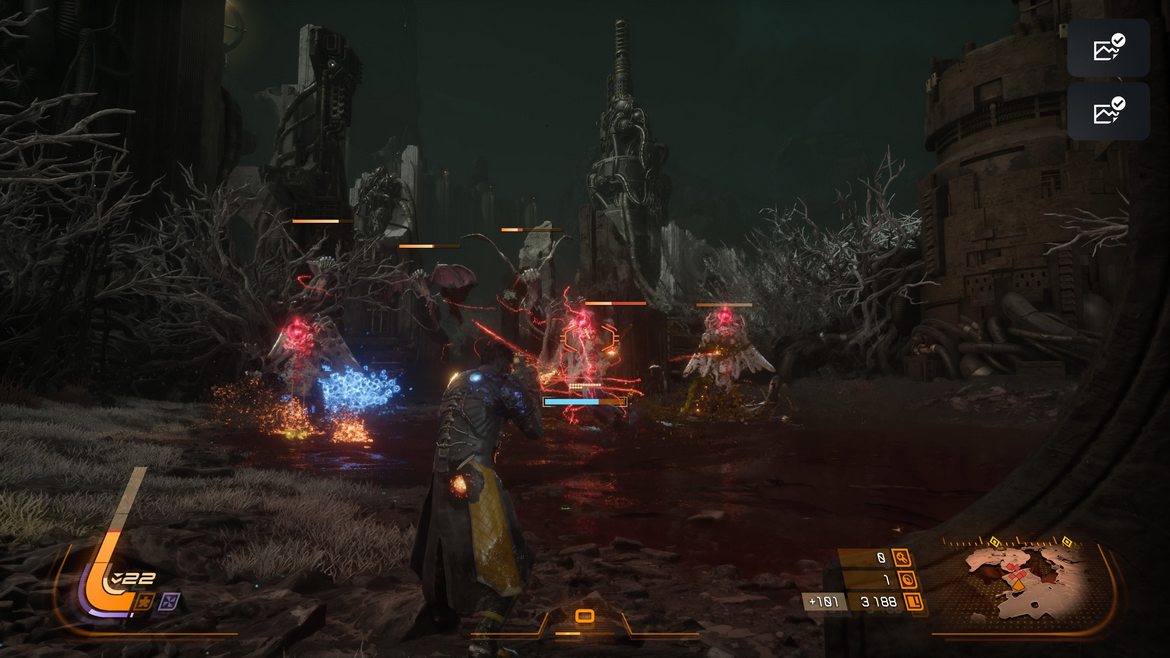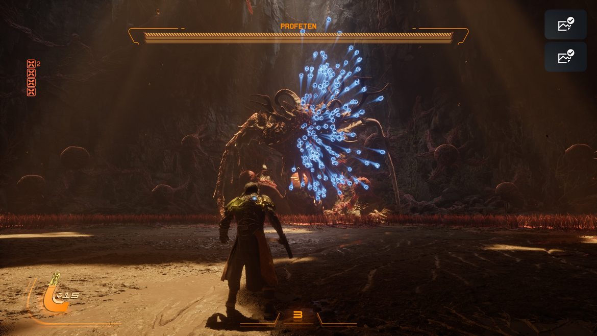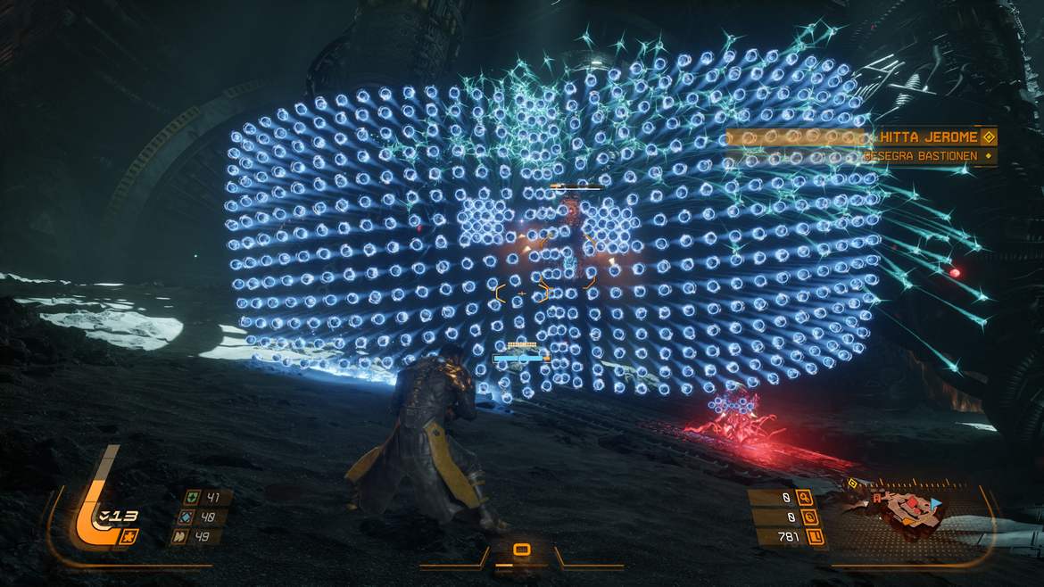 Det finns bland annat särskilda områden gömda bakom förmörkelsen där spelet i princip säger rakt ut att du antagligen kommer dö här inne. Fienderna blir brutalare, aggressivare och betydligt fler. Men belöningarna är också enorma. Och precis där förstår du vad SAROS egentligen gör med spelaren. Det lär dig att bli girig.