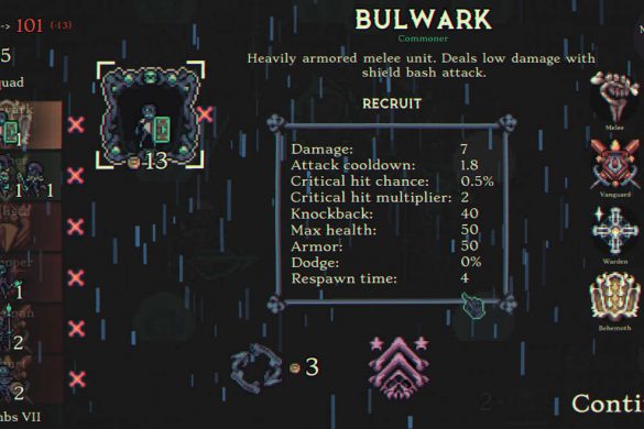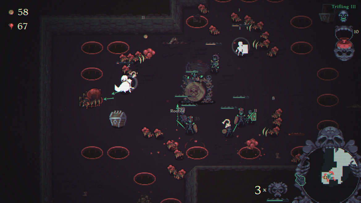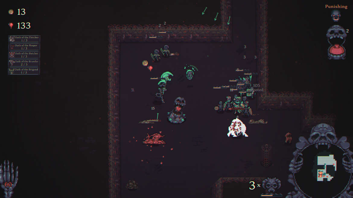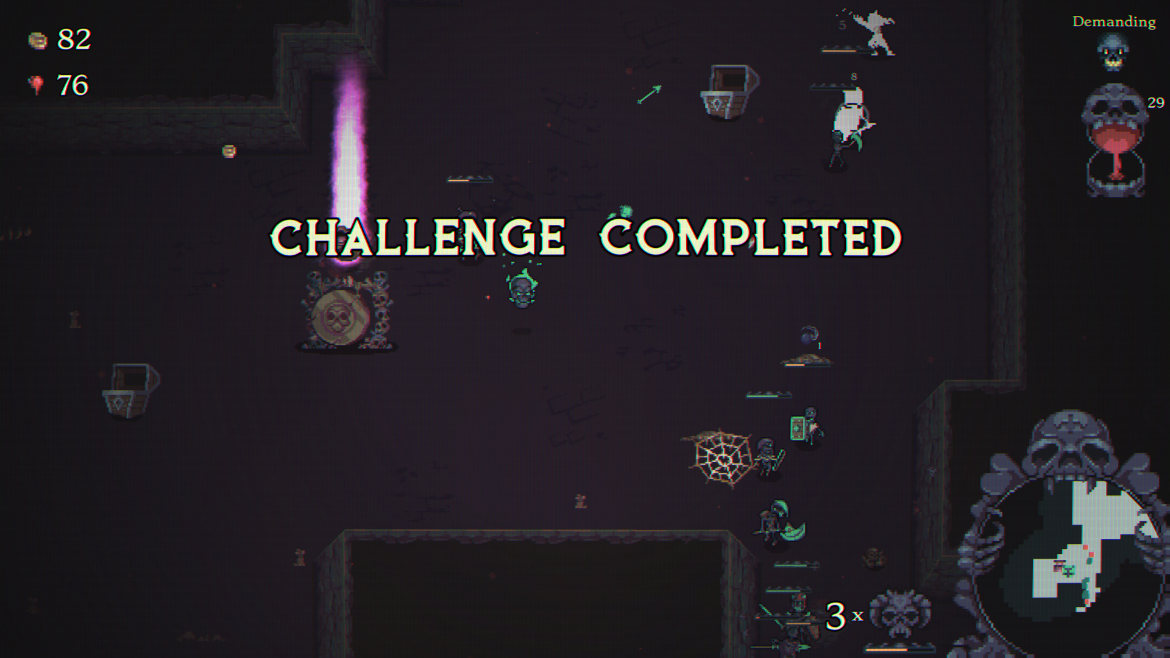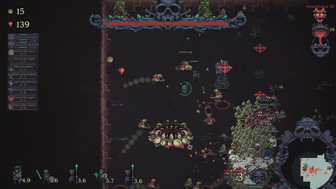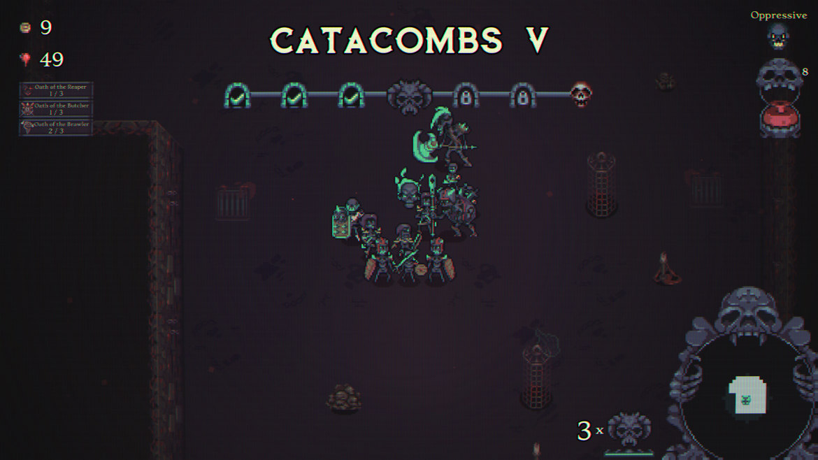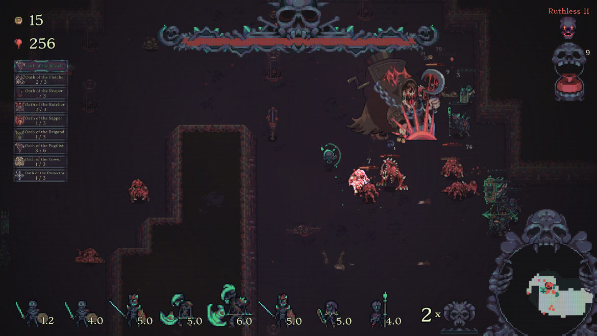 Många andra spel i genren kan bli på tok för kladdiga. Med det menar jag att värden kan sticka iväg till omöjliga nivåer där spelaren kan stå mitt i en svärm av fiender utan att tappa hälsa. Här har vi istället en väldigt balanserad upplevelse. Du och din armé kan givetvis bli otroligt starka, men du måste alltid vara på tårna. Efter att du klarat din första runda och spöat dess boss kan du framöver välja förbannelser och riter för varje ny runda. Förbannelser handlar om ibland tunga nackdelar du måste tampas med, som när till exempel vissa fiender dör och då spawnar nya fiender. Eller att vissa element fienderna drabbas av t.ex. eld eller is och blir svårare att ha ihjäl.