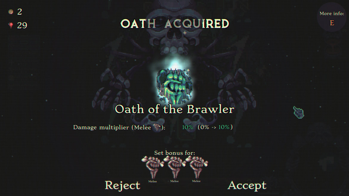 Spelet har en väldigt tydlig visuell stil som funkar väldigt bra. Det mesta ligger i en grå-blå skala där allt är mörkt och dystert där starkare färger används strategiskt för att peta på spelarens uppmärksamhet där det krävs. 8BitSkull använder en hel del chromatic aberration i menyer och effekter vilket jag personligen tycker är supercoolt och passar väl med pixelgrafik. Allt ackompanjeras med tuff metalmusik. Ljudeffekterna i övrigt är lågmälda och gör inte mycket för dopaminruset, men de gör ändå sitt jobb. Igen vill jag tolka detta som ett sätt att undanröja plotter när för mycket saker händer på samma gång.