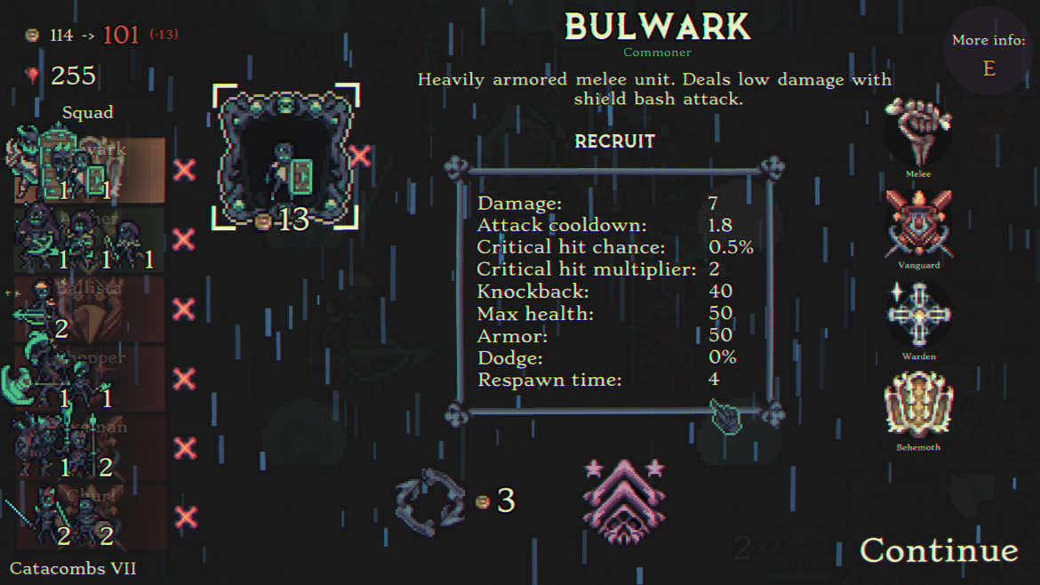 Ytterligare en viktig del i din taktik är att när dina enheter möter sitt öde sätts en respawntimer igång. När tiden rinner ut får du tillbaka din enhet. Detta kan bli kritiskt under en bossfight till exempel. Nämnvärt i sammanhanget är att det finns en del föremål att plocka upp som drar ned längden på dina enheters respawntimer. Lyckas du hitta många av dessa föremål kan du i princip bli ostoppbar. Nu kanske du tänker att du bara kan stå och hänga tills dina enheter spawnar igen? Fel. Var trettionde sekund vänds ett timglas på skärmen och höjer spelets svårighetsgrad ett hack vilket tvingar dig till aktivt spelande. Genialt drag!