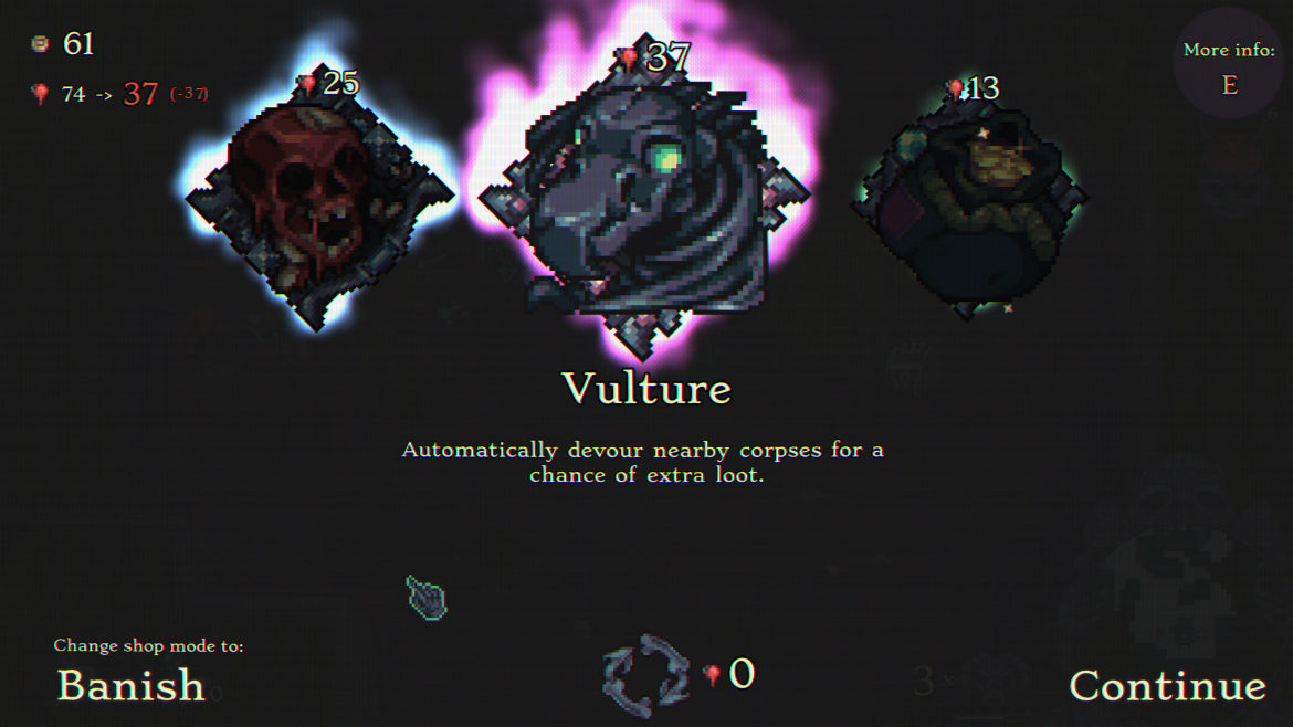 Min taktik har hela tiden varit att satsa nästan allt på min trupp då de står på frontlinjen och jag själv ska mest hålla mig i bakgrunden. Svårare fiender har också en chans att tappa föremål som du enkelt plockar upp genom att gå på dem. Om du inte är nöjd med vad du hittar kan du med en mindre summa corpuscle slumpa fram ett nytt föremål. Du kommer också märka att föremålen kommer i tre olika färger som i många andra spel är olika nivåer för hur pass bra de är. Inte här. Grön är alltid en förbättring inom något område. Blå är en fördel och en nackdel och lila är ovanliga föremål som oftast har en väldigt stark fördel eller förbättring.