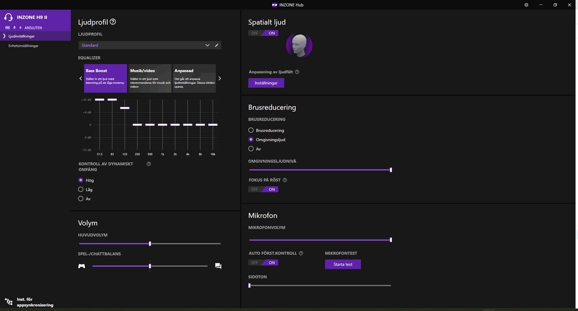 Programvara INZONE Hub för headsetet till datorn ger oss de funktionerna som vi behöver. Här finns ett urval av förinställda EQ-profiler, men att du kan göra dina egna om du vill göra en EQ-profil som passar just dig. Det finns även funktionen att skanna av dina öron för att göra en ljudprofil baserat på dem. Jag har testat öronskanningsfunktionen både här och i tidigare headset och på tidigare modeller har det aldrig riktigt kommit till sin rätta. Här kan du ställa in volymen för det du lyssnar på, samt att du kan ändra balansen på spel/chatt-volymen och vad som ska ha prioritet. Slå av eller på ANC eller växlas till omgivningsljudläge, samt hur mycket som ska blockeras/släpps in. Här kan du även justera mikrofonens volym och aktivera sidton, så att du hör dig själv.