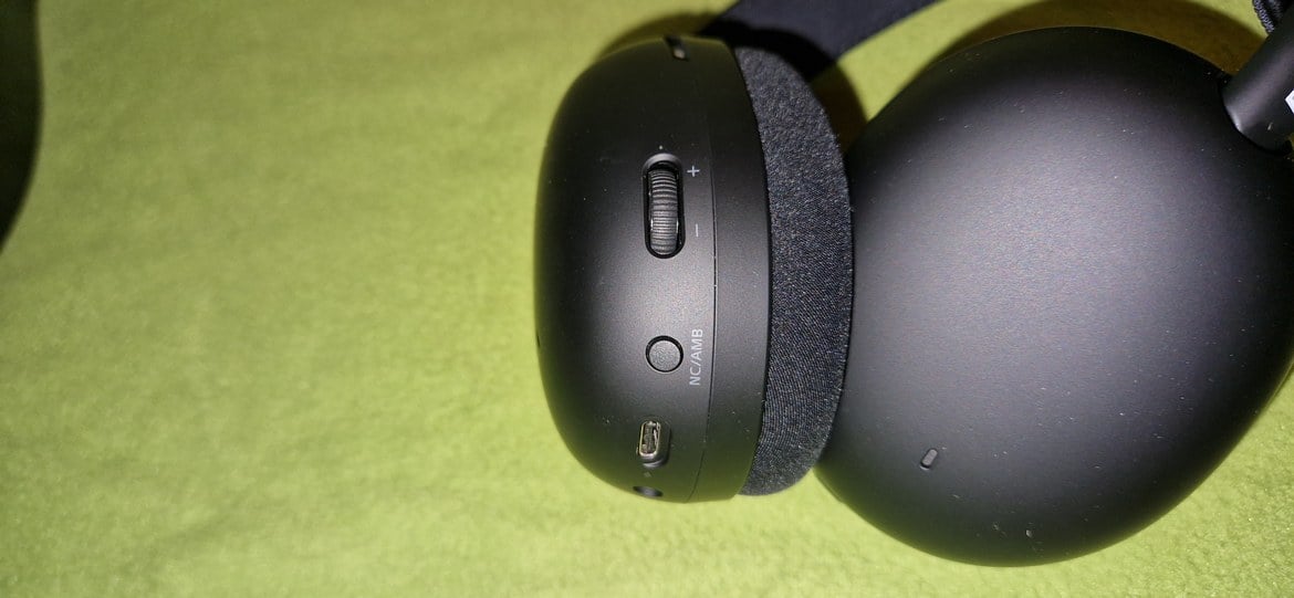 Men om vi ska kolla på vad för funktioner och knappar vi finner på öronkåporna finns det lite här att hålla koll på. På den vänstra kåpans baksida finner vi volymreglaget och nedanför knappen för ANC/omgivningsljudläget. På ovansidan bakom huvudbandets fäst finner vi knappen för att stänga av mikrofonen, den har ett klickigt ljud när du trycker till på den och det lyser upp rött på mikrofonen när den är avstängd. Där finns också USB-C-laddningsport, 3,5 mm-uttag samt kontakt för bommikrofonen.