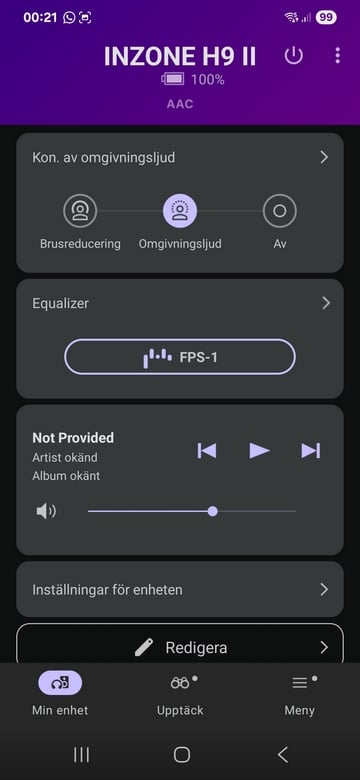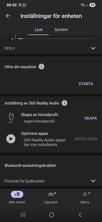 På mobilen heter appen Sound Connect och du får tillgång till EQ-profiler eller göra egna. Du kan välja ANC eller omgivningsljudläge. Samt se batteritid kvar innan du behöver ladda igen. Det är även här som du skannar in dina öron för att göra ny ljudprofil. Det är en enkel app men inte så mycket som finns här, men det som finns räcker gott och väl för mobil.
