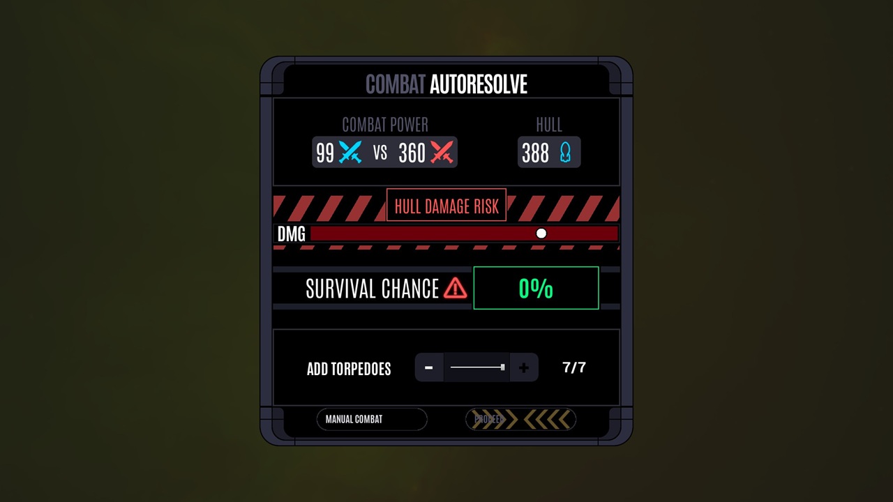 Jag tycker det är en intressant berättelse och jag gillar spel där mina val har betydelse. Tyvärr känner jag inte att det är så mycket mina val som spelar roll som det är vilken procentuell chans de har att faktiskt lyckas. Vid vissa val hjälper det att ha vissa karaktärer tillgängliga för att de ökar chansen att lyckas. En läkare är bra vid medicinska beslut och en ingenjör vid teknologiska val; det känns rätt uppenbart egentligen. Nu gäller det inte alla val, men många gånger misslyckas jag med det jag vill göra på grund av slumpen. Det känns oerhört surt att, på grund av ren otur, förlora strider eller att skeppet tar skada när det samlar in material. Kombinera det här med att varje profil bara har en sparfil resulterar det i en bitter smak när jag upptäcker att jag inte kan komma vidare på min nuvarande resa.