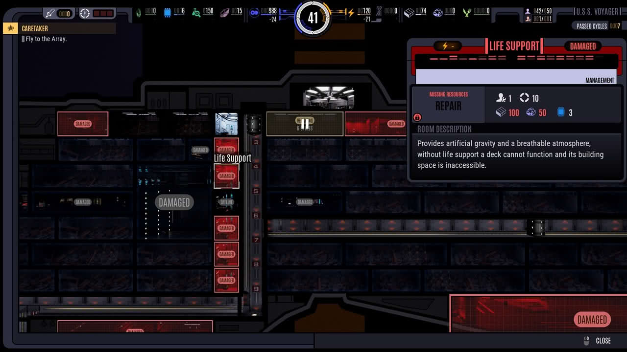 Voyager reser från sektor till sektor i deltakvadranten, samlar in kunskap, besättning och material för att klara resan hemåt. Det är en del att hålla koll på under resans gång som bränsle, bygg- och forskningsmaterial, mat och besättning. Dessutom behöver besättningen ha någonstans att sova och äta för annars sjunker deras moral och de kan välja att lämna skeppet. Eftersom skeppet tog stora skador på grund av energivågen behöver jag laga maskiner för att få tillgång till hela våningar där jag sedan kan rensa rum på skräp för att bygga nya rum. Det krävs dock en del planering, för jag har bara en begränsad mängd byggmaterial och en begränsad mängd elektricitet för att hålla igång rummen.