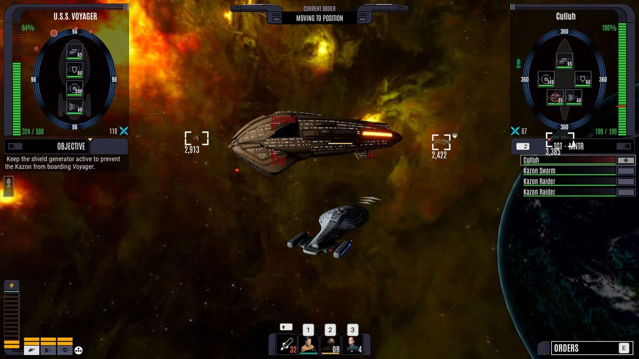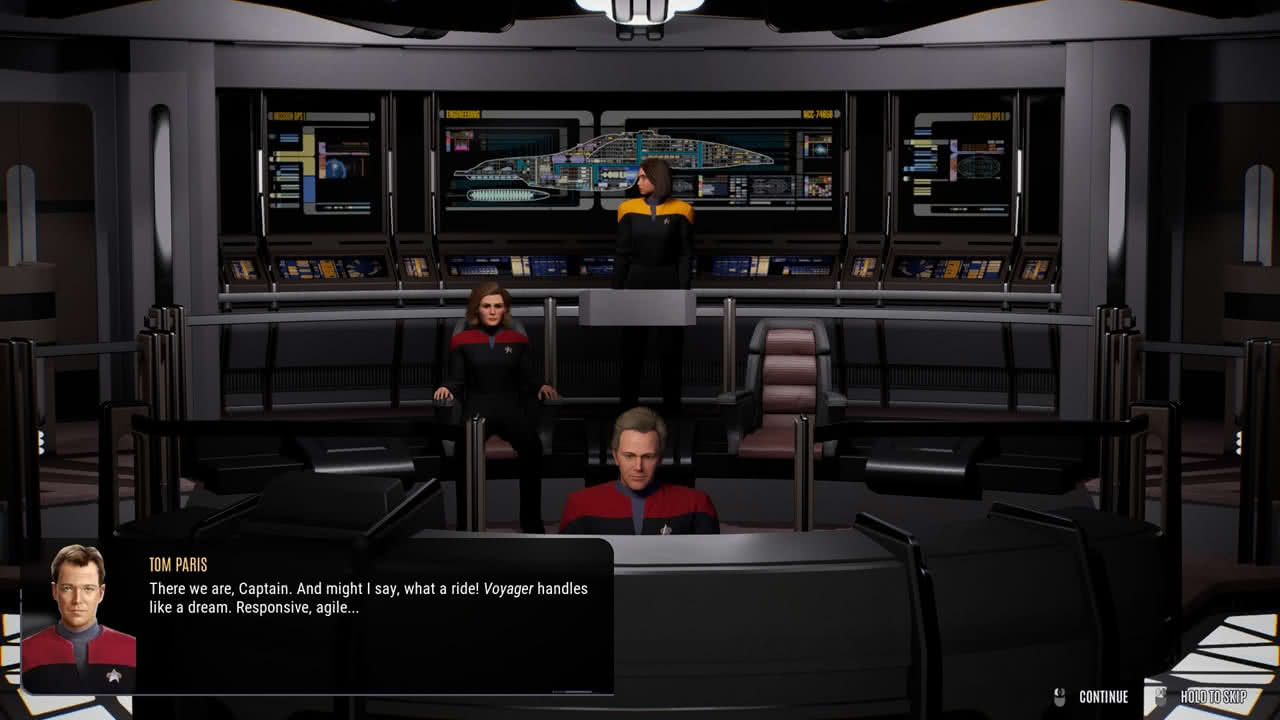 Ibland blir det strid och det kan vara på grund av mina val eller att det dyker upp fientliga skepp i bakhåll som attackerar. När det blir strid kan jag antingen låta slumpen avgöra eller själv ta kontroll över Voyager. Eller, kontroll och kontroll, jag kan välja mellan olika kommandon och aktivera missiler samt förmågor från de besättningsmedlemmar som deltar i striden men det är allt. Känns återigen som att det är mer slumpen som avgör om jag går vinnande ut ur striden än min skicklighet. Hade varit kul om jag hade fått flyga runt skeppet själv samt sköta vapnen.