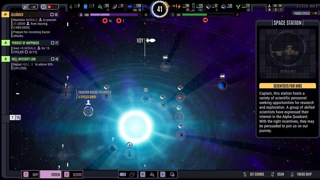 Utöver det känner jag att det är lite rörigt att hitta olika platser eller efterforska olika saker för att komma vidare i huvuduppdragen. Det är de här uppdragen som har varit den största anledningen till att min besättningsmoral sjunker, för med spelets alla menyer och rum är det ibland svårt för mig att lista ut vad det är de vill att jag gör. Ett exempel: jag ska forska fram en lösning på ett problem (det låter vagt men det är för att det finns flera uppdrag med just den här delen) och jag tänker då att lösningen finns i menyn med vad jag kan forska fram. Efter att ha spenderat flera minuter i de olika kategorierna och inte hittat något fortsätter jag att spela och funderar på varför jag inte kan komma vidare. Det står ju där till vänster på skärmen att jag ska forska efter den här lösningen men jag hittar den ju inte! Det visar sig att jag ska göra den här forskningen i rymdskeppets vetenskapslabb, inte på forskningsmenyn. Ja, där känner jag mig dum men samtidigt, varför behöver spelet ha två olika platser för att forska fram saker? Jag kan komma åt forskningsmenyn via labbets meny, men den har också sin egen knapp på tangentbordet för snabb åtkomst. Det är kanske bara jag som inte tänker tillräckligt långt här men det hade kunnat vara tydligare.