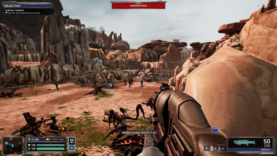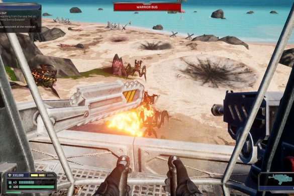 Vapnen i sig gör däremot ett helt okej jobb med att bära upp spelets tempo. De känns tillräckligt kraftfulla och responsiva för att varje möte med insekterna ska bli underhållande, även om arsenalen i slutänden inte är särskilt minnesvärd. Om du däremot har stenkoll på Starship Troopers, kommer du känna igen en och annan puffra. Vapen som biter ordentligt i de olika fiender som hittas här. Flygande skalbaggar som skjuter eld eller frätande syra. Eller samma stora kreatur som sprutar mängder av lava. Det är en god mix, men samtidigt märks det mot slutet av sista banan att det ändå är stramt med fiender totalt. Här hade jag gärna sett fler – och framförallt bossar. Något som spelet saknar till stor del. Där andra spel får dig på tårna i bosstrider är det snarare just mängden fiender som spelar roll här – särskilt i de högre svårighetsgraderna där du kan dö på två hugg!