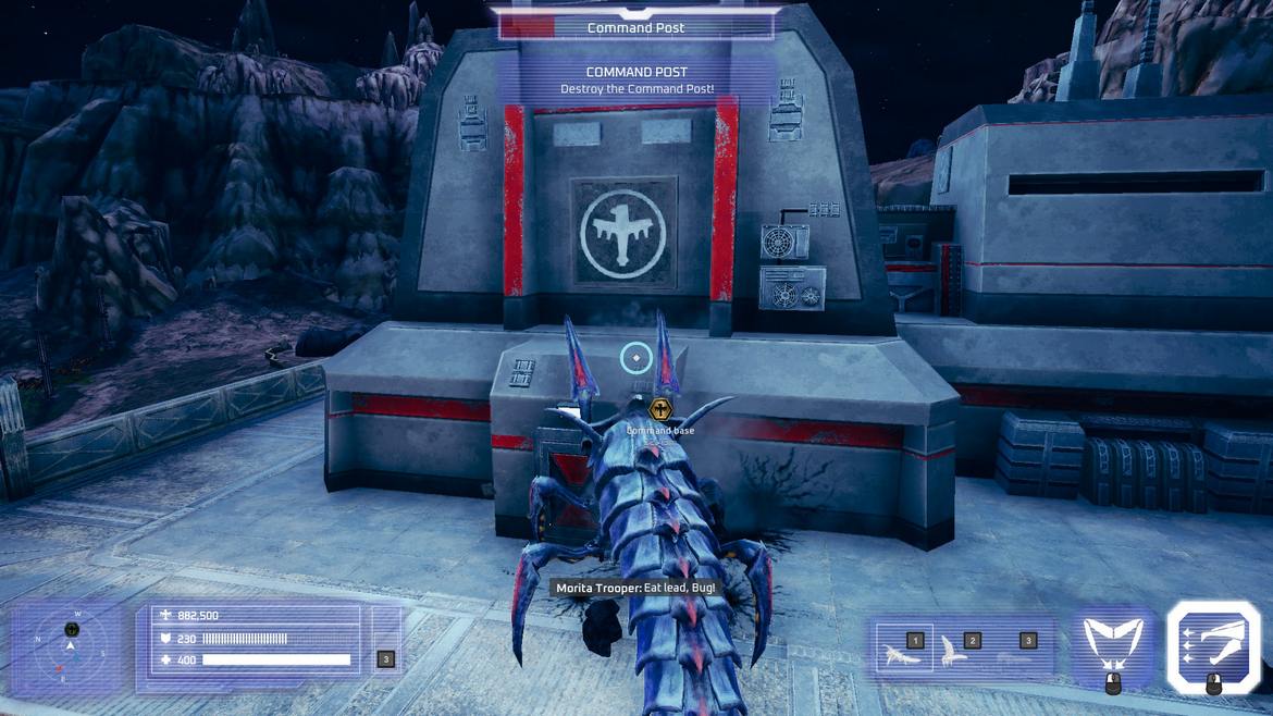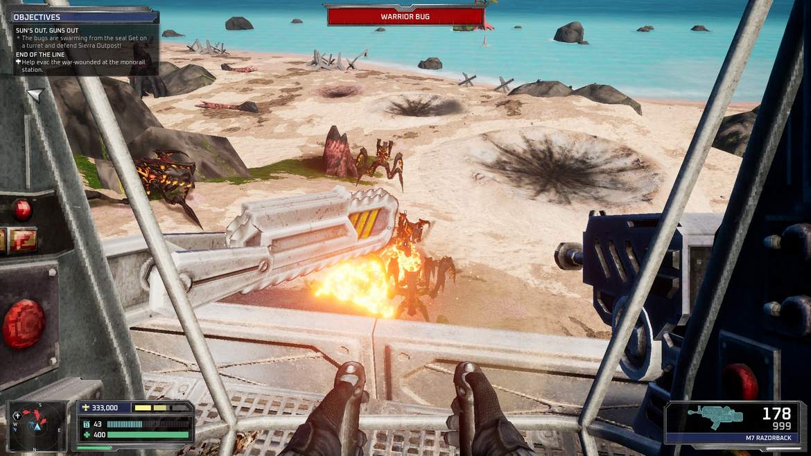 Det hjälper inte heller att de sju banor du upplever är korta och att normalsvårighetsgraden är alldeles för enkel. Förvisso har du fyra svårighetsgrader att välja mellan (”Recruit”, ”Trooper”, ”Veteran” och ”Citizen”), vilket kan skänka mer speltid och faktiskt också ett betydligt mer intensivt tempo för de mer hängivna. Samtidigt, när du väl sett alla sju banor – och de fem banor där du spelar som insekt – då har du i princip sett allt spelet har att erbjuda. Och allt såg i slutänden väldigt likartat.