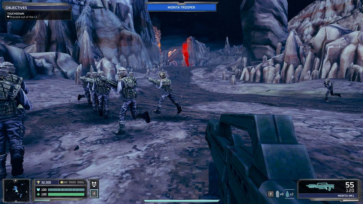 Vad får du om du kombinerar Duke Nukem, satir och Starship Troopers-filmen? Detta förnumstiga lilla spel. Ett spel som tydligt försöker locka oss gamla Starship Troopers-älskare med gamla hederliga Full-Motion-video-sekvenser (FMV, som dessa video-mellansekvenser kallades i korthet förr) samtidigt som du får en ’boomer-shooter’ som kastar in dig i stridens hetta från första sekund. En kul överraskning som dessvärre tappar sin retroflörtande charm redan efter fyra–fem timmar. Av den enkla anledningen att du är klar med spelet. Åtminstone sett till normalsvårighetsgraden som givetvis också heter ”Trooper”.