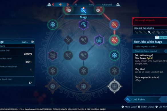 Spelet har såklart de klassiska klasserna (eller jobs som de kallades) man kan låsa upp, det finns allt från Red Mage till Dragoon. Genom att använda de olika och levla upp dem, låser man upp nya förmågor och attacker till dem. Men man kan låsa upp nya klasser om man levlar upp en och ibland måste man ha låst upp en eller flera andra klasser för att få tillgång till en specialjobb. Varje klass kan man levla upp till nivå 30, sen är det bara att välja en ny och börja levla upp den. Visst det är kul att vi har med mer eller mindre alla klasser som funnits i Final Fantasy, men jag hade hellre sett att man bara hade vissa och kunde specialiserat sig på dem än att ha alla man kan byta mellan. Det är kul om man vill ta sig tid att levla upp alla bara för att man kan, men i slutändan är det tid som jag kan lägga på annat, jag höll mig till vissa klasser som Swordsman och använde den primärt.