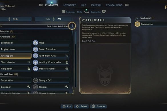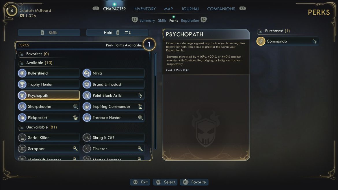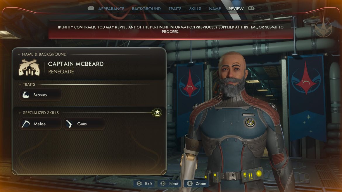 Utöver utseendet får jag också forma McBeards personlighet och spelstil. Detta görs genom att jag får sätta poäng i olika menyer och sedan göra val. Först ut är egenskaper där jag väljer grunden till min karaktär. Egenskaperna är indelade i positiva och negativa drag. De positiva som Muskulös, Briljant eller Karismatisk, påverkar allt från strid och konversationer till hur världen ser på mig. Jag kan välja upp till två positiva egenskaper men varje styrka kräver en svaghet. Väljer jag bara en egenskap i början behöver jag inte välja en negativ, men tar jag två egenskaper då behöver det balanseras upp med en negativ. De negativa dragen kan vara både absurda och brutala. En av dem, “Skrovlig”, gör till exempel rösten så oangenäm att ingen vill prata med mig. Resultatet? Jag kan aldrig nå högre än “neutral” relation med någon fraktion.