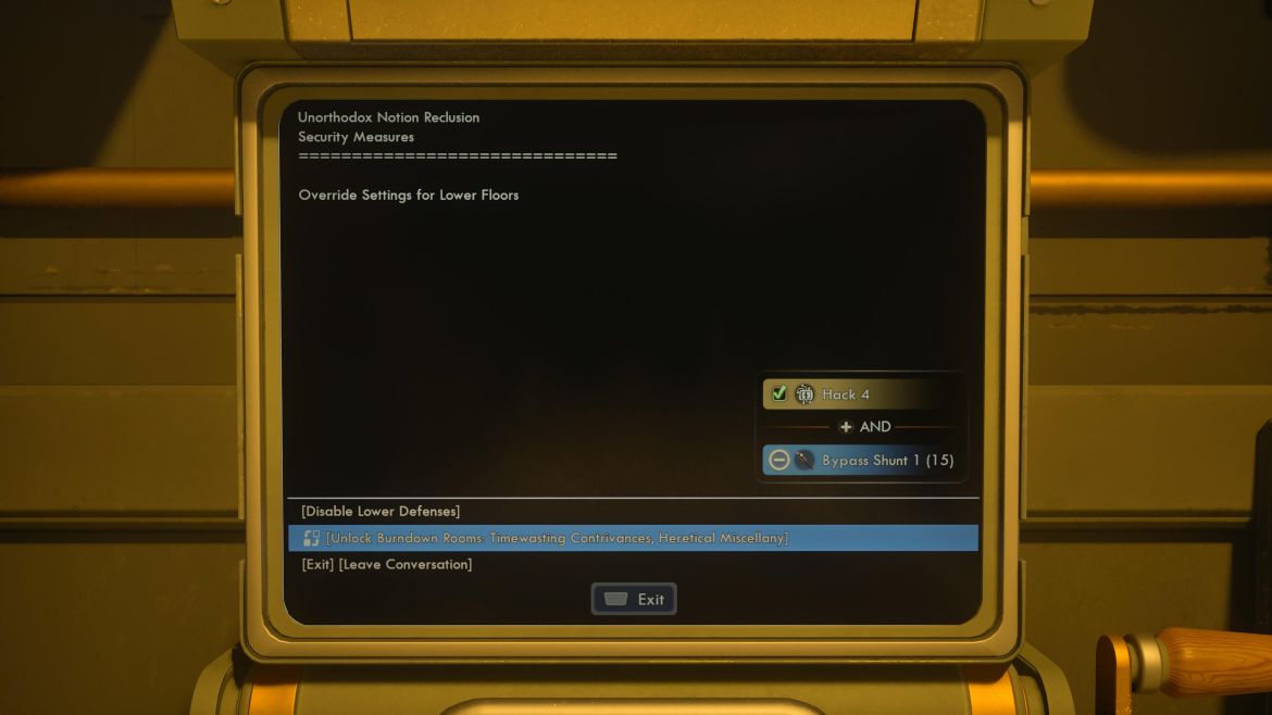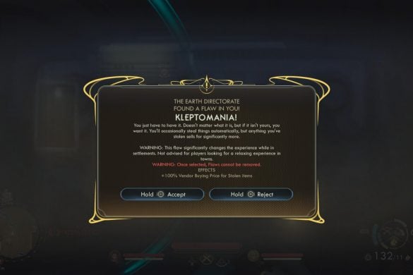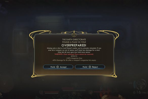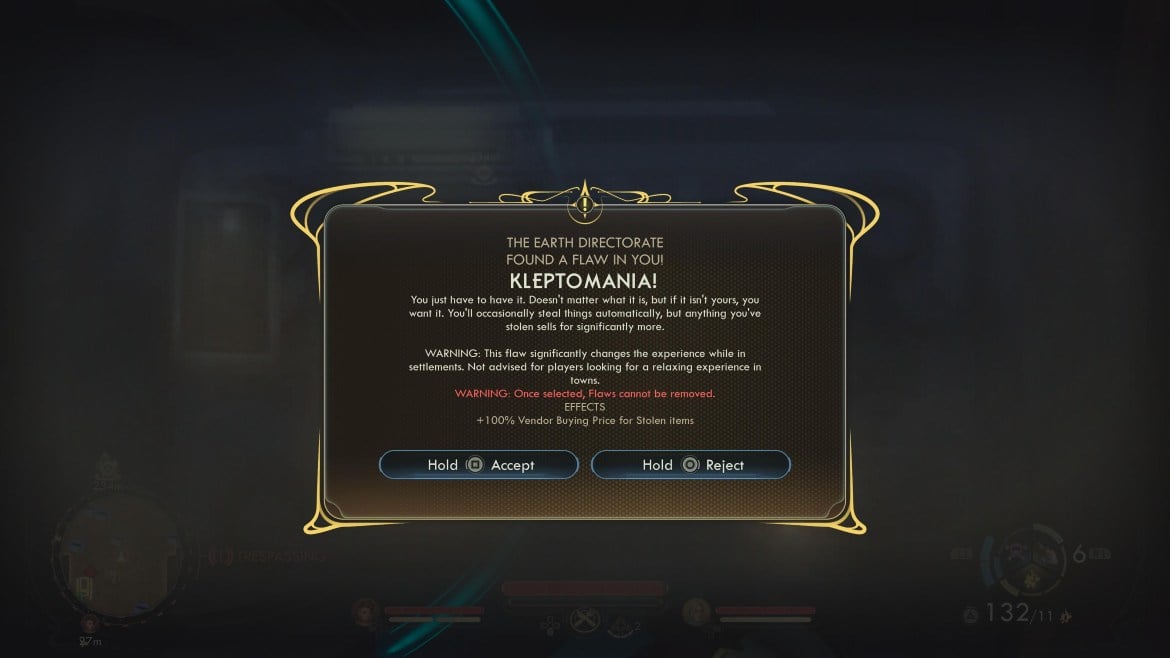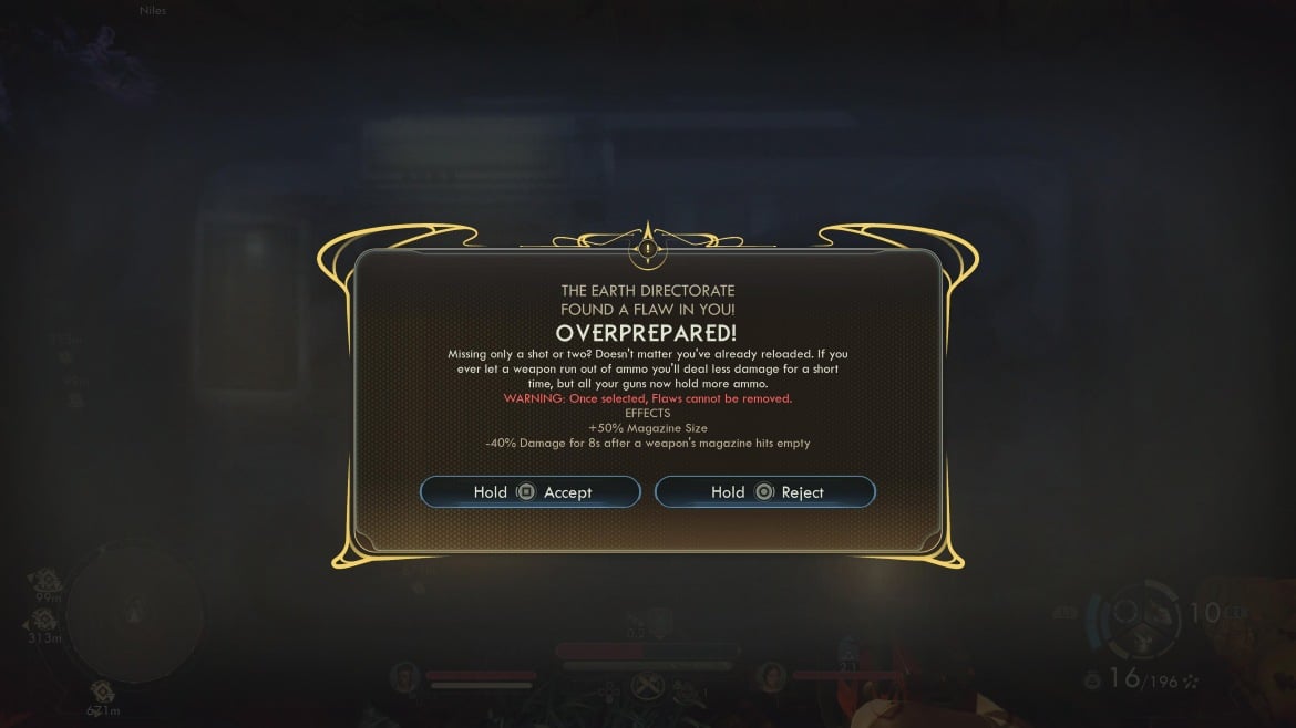 Under spelets gång kan jag dessutom erbjudas flaws = brister baserat på hur jag spelar. Till exempel missar jag många skott får jag möjligheten att acceptera en egenskap som ger 50 % större magasin, men 40 % mindre skada i åtta sekunder efter att magasinet är tomt. De här egenskaperna är permanenta men helt frivilliga och kan ibland vara helt tokiga. Ett annat exempel är den som visats tidigare från utvecklarna är den som ger 50% ökad hastighet när jag går på huk men ger mig så dåliga knän att fienderna hör mina knakande leder när jag försöker smyga. Detta är ett lysande sätt att göra spelets progression överraskande, riskfylld och personlig.
