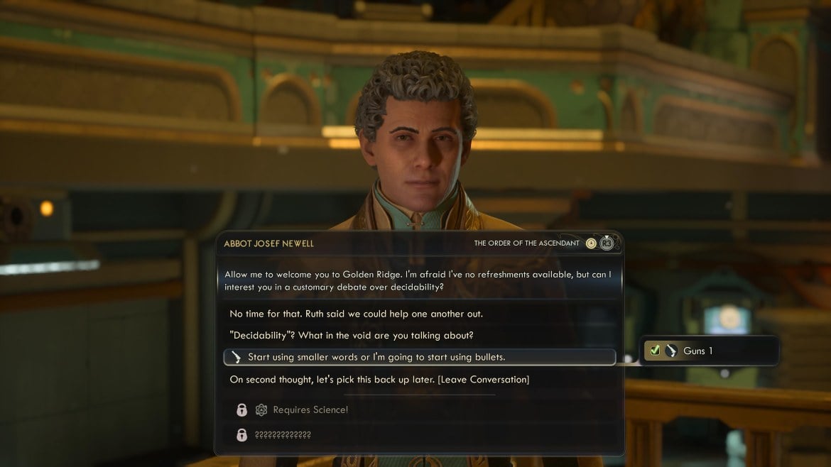 En totalitär diktatur, ett megaföretag och en grupp galna vetenskapsmän. Valen att alliera sig med någon står mycket mellan pest eller kolera. Med det sagt, måste jag verkligen alliera mig? En stor del av mekaniken i det här spelet, Obsidian rollspelet, är val. Valen jag erbjuds är oändliga. Jag vet faktiskt inte alla resultat av alla val jag kan göra och det är just det som gör spelet så spännande. Dialogvalen är många och jag har flera gånger gjort mig ovän med karaktärer jag trodde skulle vara huvuduppdragsgivare som till slut slutat prata med mig, antingen för att vi blev ovänner eller för att den personen fick käka bly. Likaså har jag gjort mig allierad med ett gäng jag trodde var spelets skurkar men det visade sig att de kunde erbjuda en alternativ lösning på ett uppdrag jag hade. Det blir i mångt och mycket min resa med Kommendör Captain McBeard.