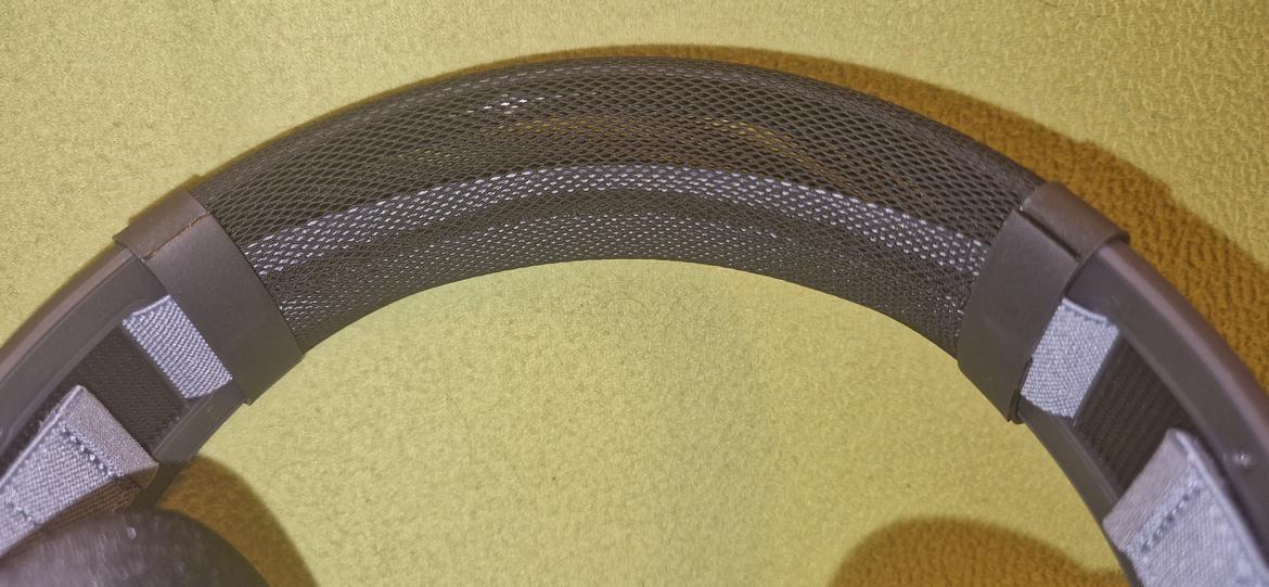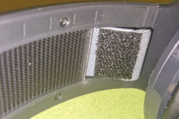 Huvudbandet är inte en traditionell variant med ett helgjutet plastband och en undersida av minnesskum som går över hjässan . Här får vi ett ”flytande” huvudband som ligger innanför en tyg-mesh som håller det på plats (se bild). Du kan dra åt det och få lite mer avstånd från huvudbandet, där du fäster det med kardborrband. Jag personligen hade föredragit ett mer vanligt pannband, då jag tycker det blivit lite väl mycket pillande med att få båda sidorna att sitta rätt på rätt längd. Det blir att den ena sidan inte är mer neddragen än den andra – när väl jag fick det att vara som jag tyckte var bäst rörde jag det ej mer.